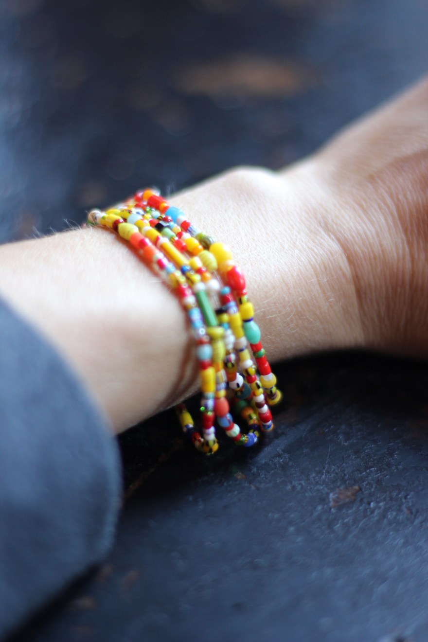 They are really easy to make! All I do is cut a piece of Elastic Thread necklace length and tie a loose knot at the end to keep the beads from rolling off. I then thread as many beads as I want for my necklace/bracelet. When I have threaded all the beads, I untie the loose knot at one end and tie the two elastic threads together securing with several knots. This thread is slick and the knots like to come undone. To prevent this, I cut the threads close to the knots then dab a small amount of superglue on the knot and allow to dry. Within 30 minutes, I have a colorful and fun necklace/bracelet!