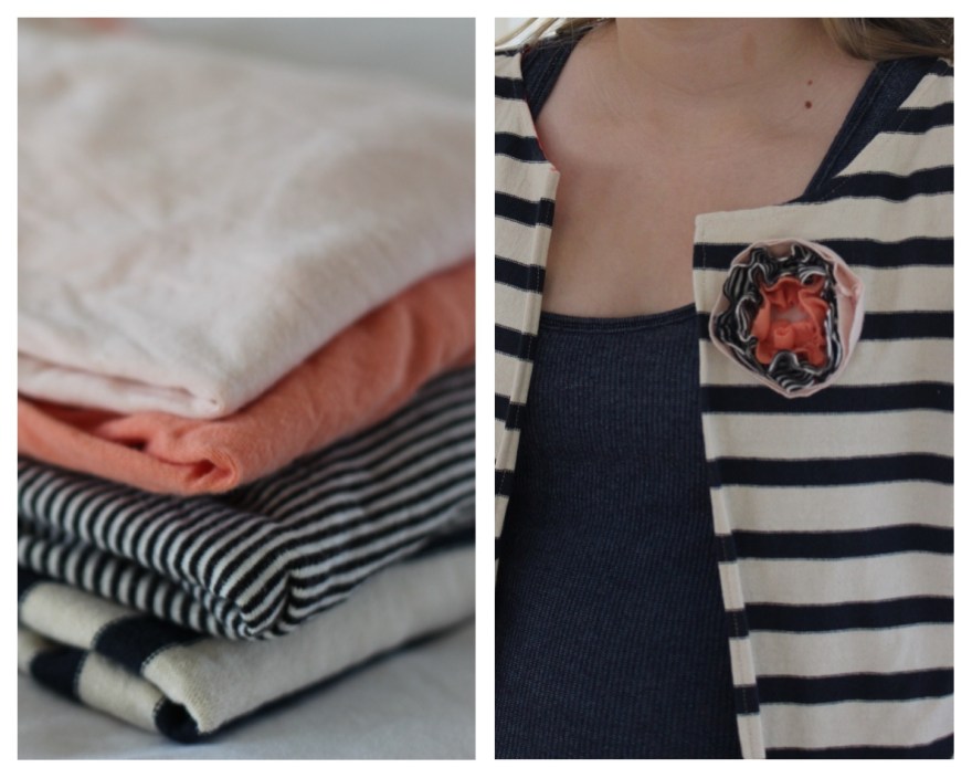To start off, I picked an old striped shirt and made it into a cardigan by cutting down the middle and finishing the edges (I folded and pressed each edge in by 1/4 inch and folded again then straight stitched to finish.)