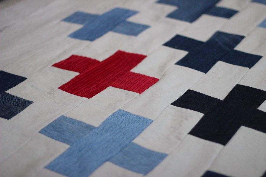 I’m in the middle of repurposing some old old jeans into a quilt design that has been on my mind for awhile. And yes, still obsessing on the Red Cross symbol. It must be the ER doctor in me. 🙂