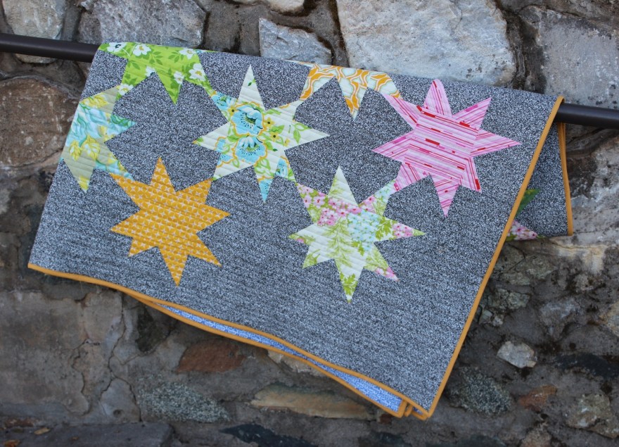 I finally completed my “Jane Fell in the Brambles” quilt, previously blogged here: https://entropyalwayswinsblog.com/2013/10/30/jane-in-the-brambles-quilt-top/. It is an adaptation of Elizabeth Hartman’s Sparkle Punch quilt using fabric from Heather Bailey’s Nicey Jane line, Alexander Henry’s Ghastly Bramble fabric and a Kaffe Fassett print for the back. I went with varied width horizontal lines for quilting. The colors remind me of spring and make me happy in these short winter days.