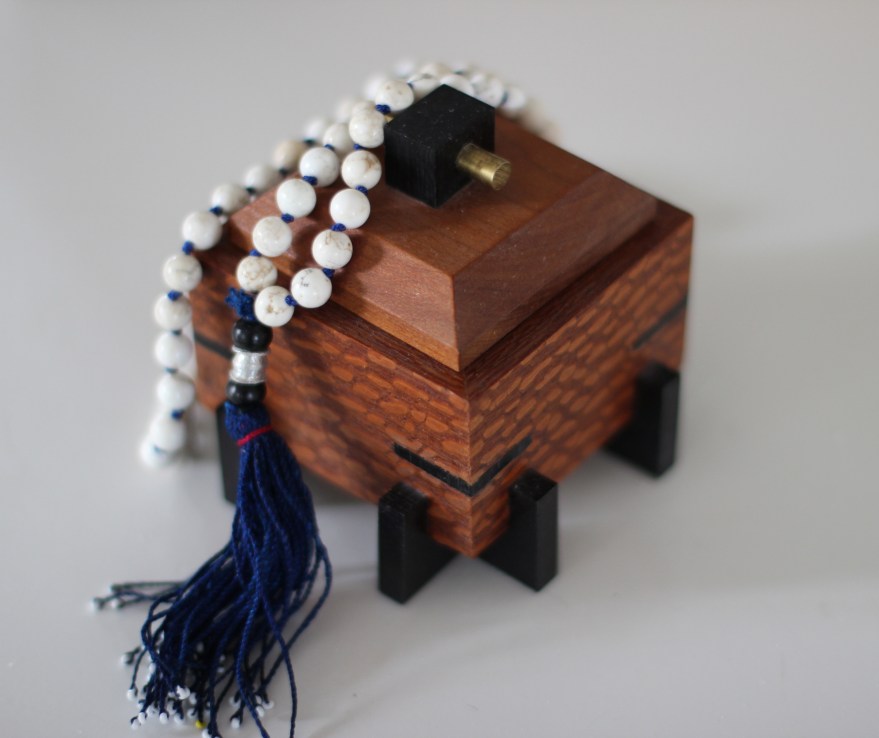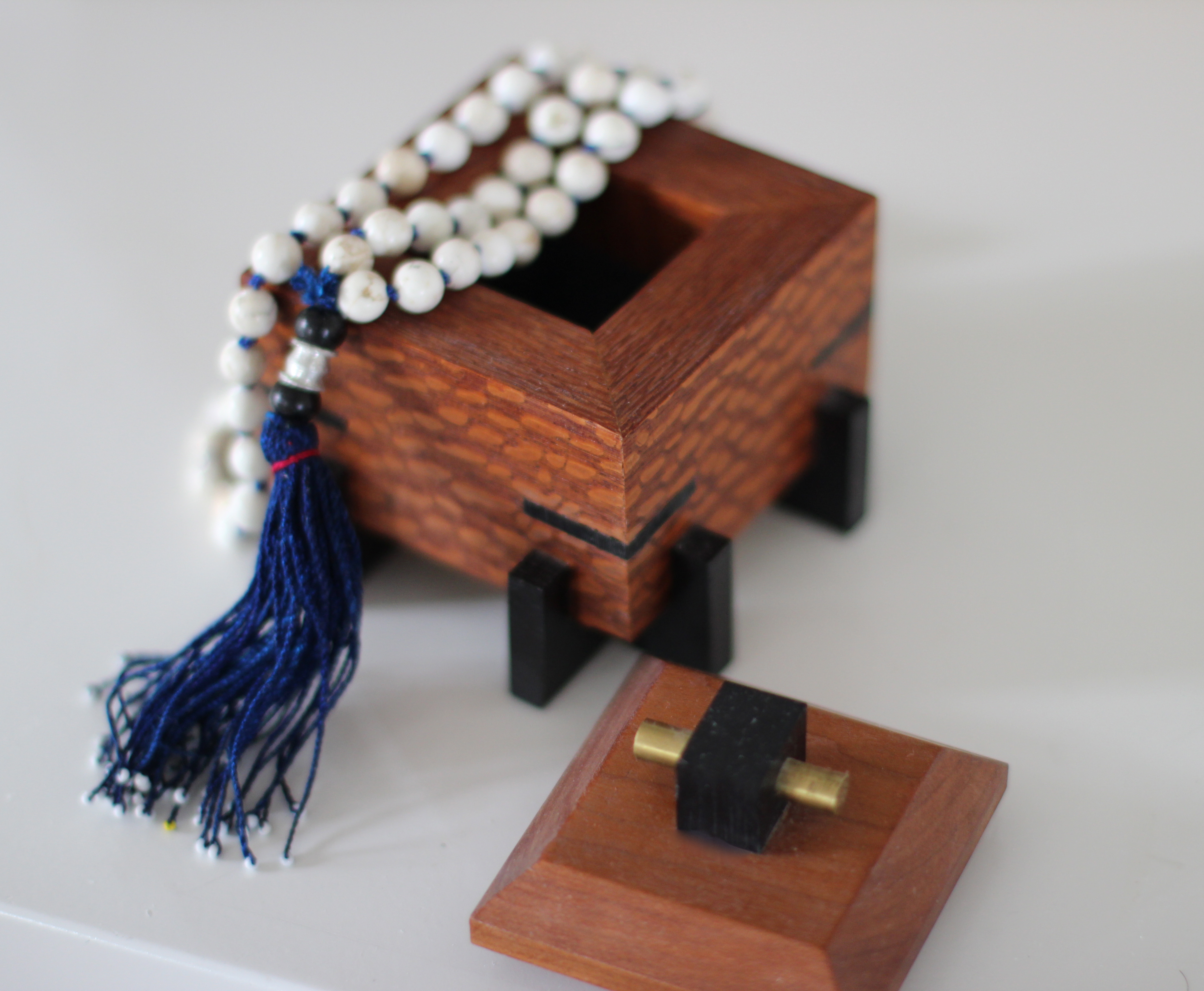 My creative efforts have been a little frustrating lately. I ran out of fabric in the middle of making another geometric baby quilt top and a shawl I am knitting is turning out more washcloth size then shawl size. I did however finish up a Mala requested by my husband for his woodworking shop. Not only is his shop full of huge power tools, it is his man cave of sorts. On the walls, he has hanging his long surfboard, climbing gear and memorabilia from the kids and I. He wanted one of the necklaces I make before I had used up all my favorite Turkish Tassels. (Tutorial here: https://entropyalwayswinsblog.com/2013/11/08/making-malas-a-tutorial/). I thought it was appropriate in turn to show it off with one of the wood boxes he made me in that man cave a few years ago to store my rings. Isn’t it beautiful? He is quite a woodworking artist.