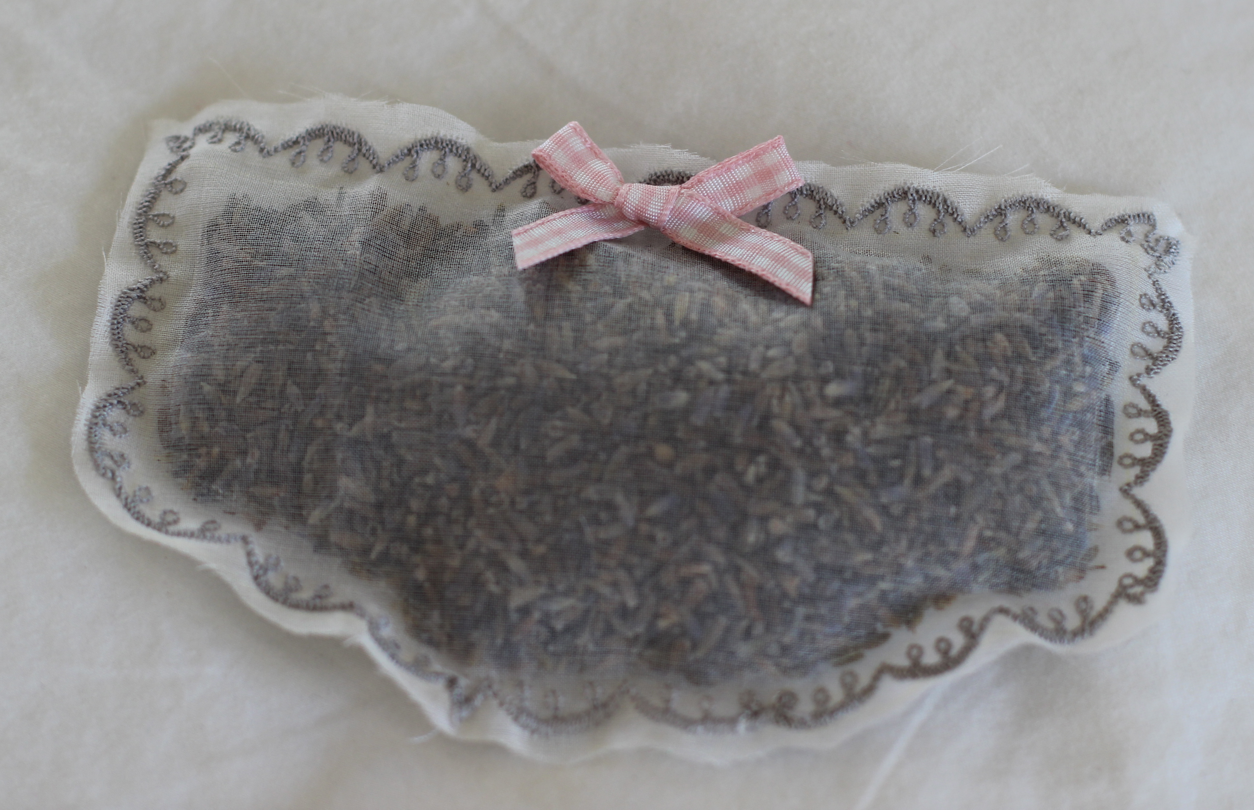 Basic Instructions: Mark off with fabric marker a rectangle 5 inches by 7 inches and cut around these rectangles in the silk organza allowing a generous 1 inch border to make stitching easier.   Make symmetric diagonal cuts on the lower rectangle corners to make it into the shape of underwear.  Pin the two pieces of organza together in the middle of the rectangle to keep them together when sewing.   Using a decorative stitch, sew around the edges along your marked lines, leaving the bottom open. Using your funnel, fill the sachet with lavender. Finish the bottom with the same decorative stitching to seal the lavender in place.  Trim the edges of the organza on all sides close to the stitching.   Using some of your thread, hand sew one of the small bows in place in the top center and you are done!