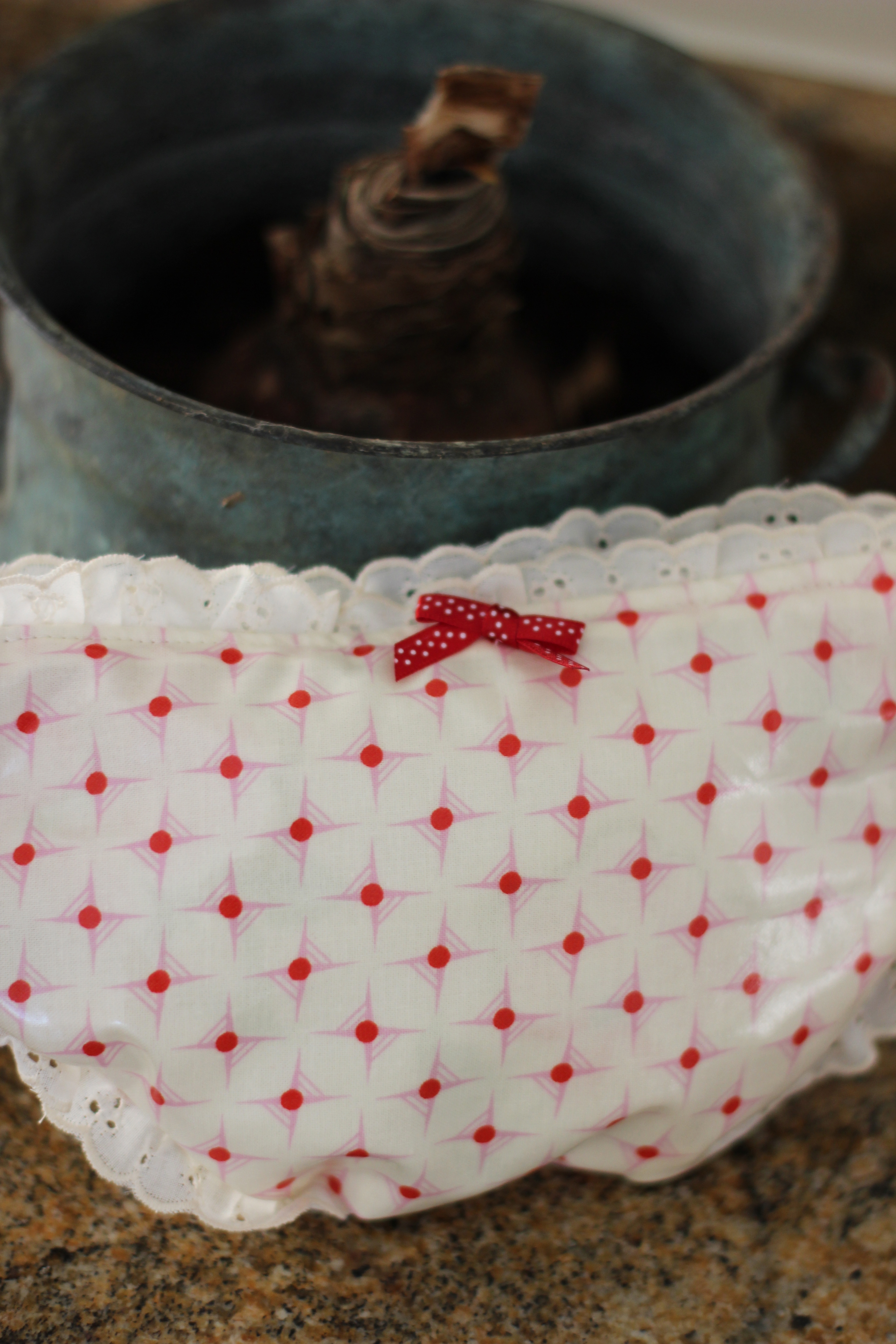I decided I needed a little bag to hold my sachets so I used some Laminated Cotton from Heather Bailey’s Nicey Jane line and made an underwear shaped bag with frills to match my sachets.
