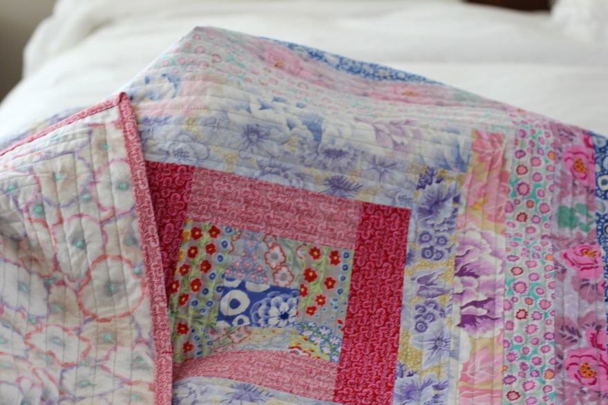 I quilted up The Backstory Quilt today. It is on it’s way to one of the only girl babies (and her mama) in my sphere. I loved using the back of the Kaffe Fassett fabric so much for parts of the front that I flipped the fabric over for the back and the binding. It is so soft and girlie. I quilted it in straight lines following the rectangular shape of the quilt.