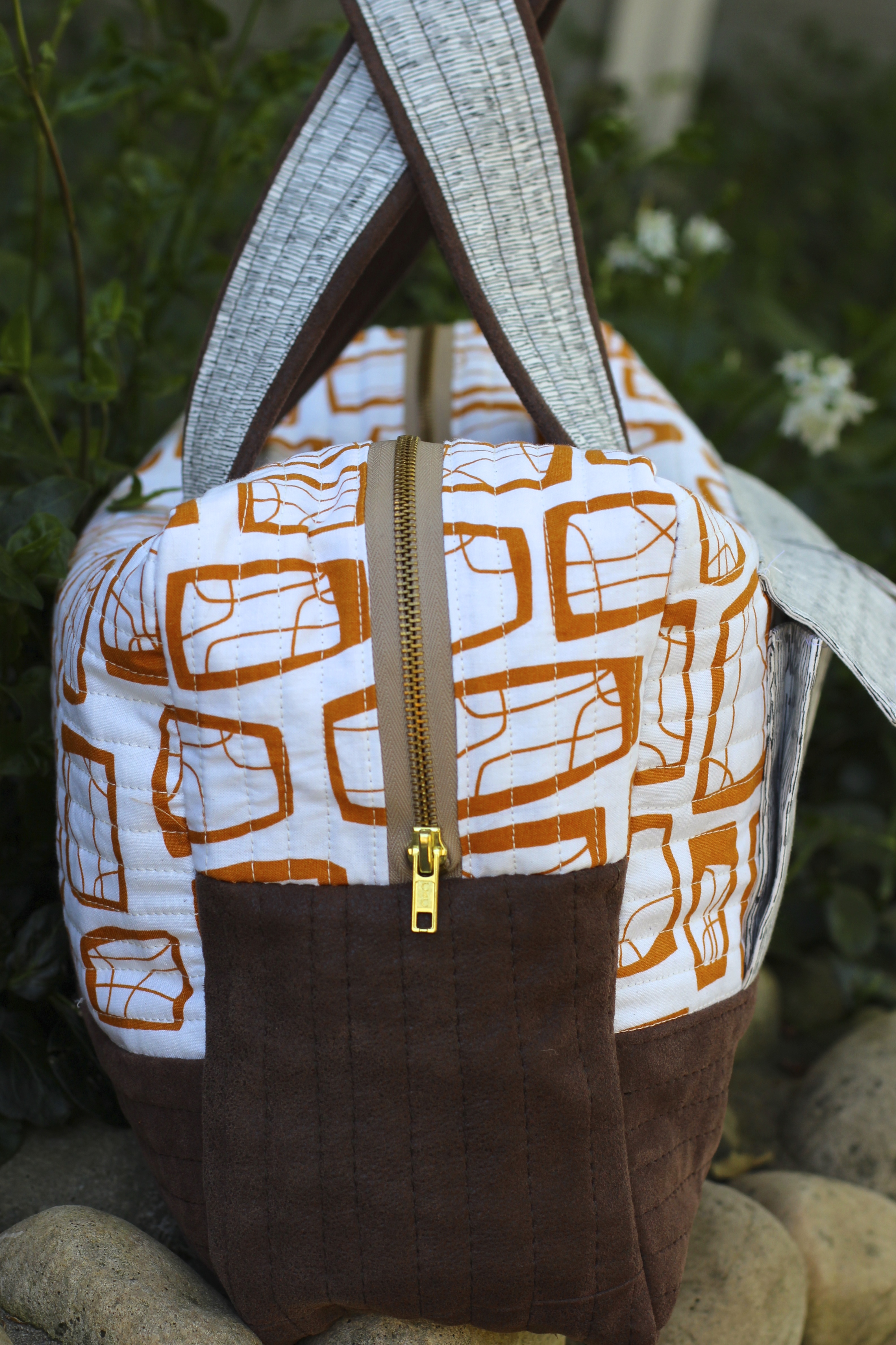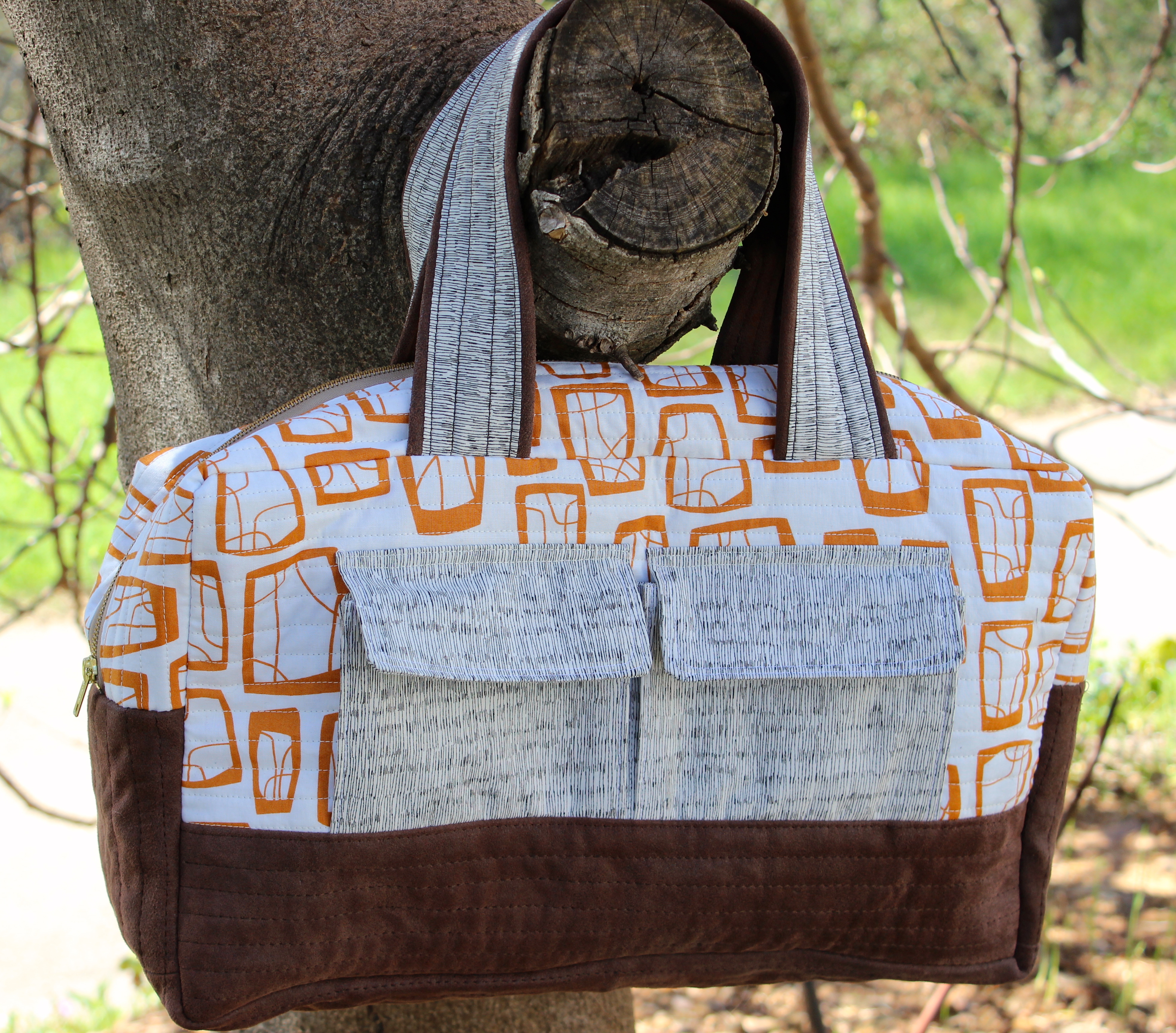 What’s that you say?  You want to see the inside?  Let’s just say that I’m super psyched that Kristen from Skirt as Top has a tutorial for lining that I will be trying out. (catnap cargo duffle (with mini tutorial on how to add a lining) | skirt as top.)  Halfway through quilting the sides I realized that the beige bobbin thread looked pretty darn ugly on my brown interior canvas.  C’est la vie.  I’ve decided also to skip the snaps as I made this one for myself and I like having my pockets open and easily accessible.  My hat is off to Anna who designed another great bag.  A bag’s success or failure for me often ride on whether the handles are beefy enough to hold the bag and gear (I tend to overstuff bags) and whether the weight of the body is hefty enough to keep it from seeming too homemade.  This bag rates well on both.  Free pattern here:noodlehead: Cargo Duffle Pattern for Robert Kaufman.