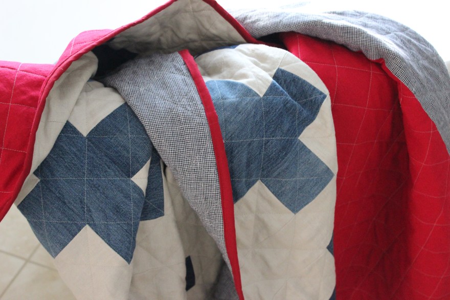 I tried to partially echo the Plus design from the front on the back and quilted this up on the diagonals.