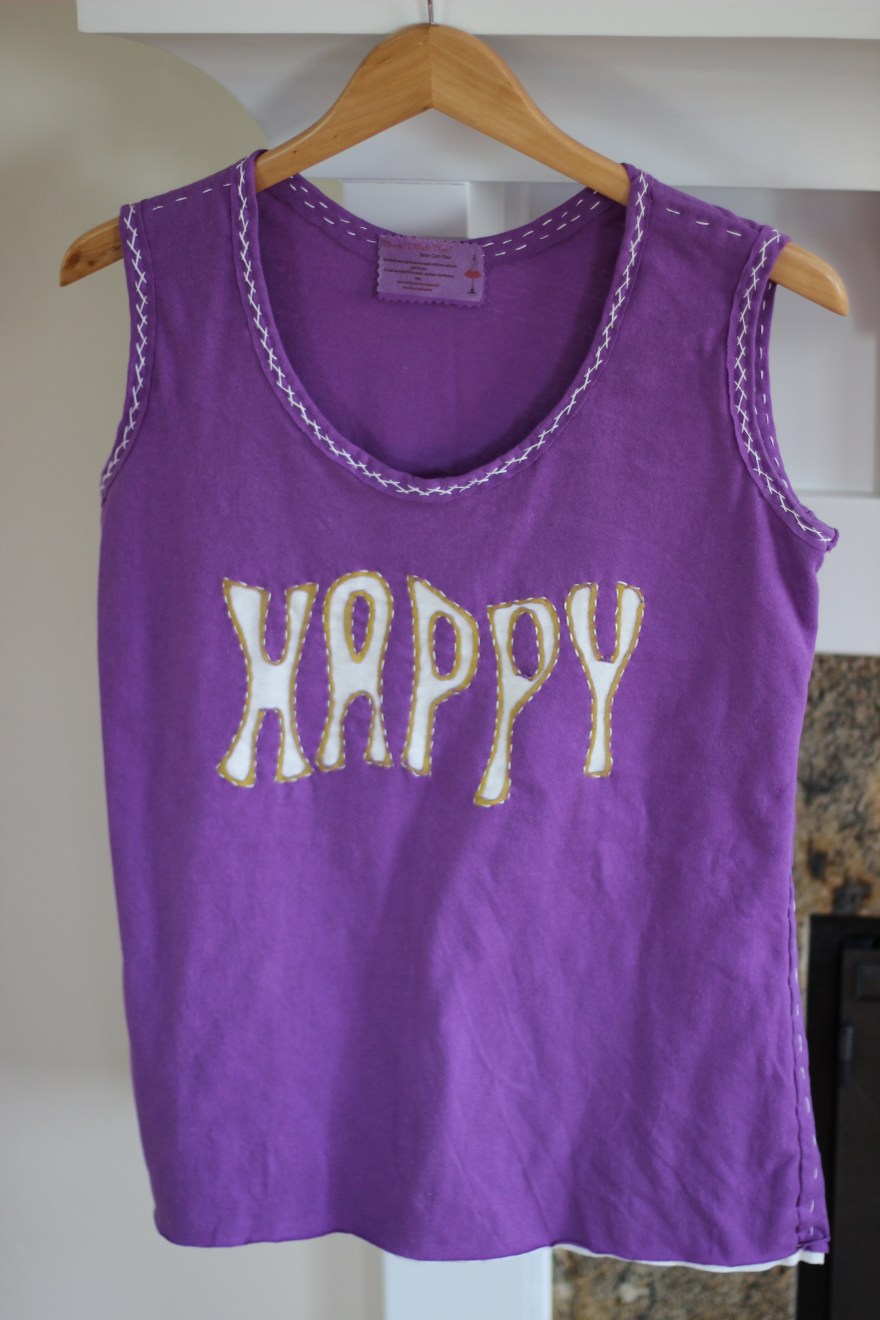 A little early for “Success Saturday”, but definitely in lieu of “Failure Friday”, I finished up my hand-stitched “Happy” shirt and must admit it makes me happy. While running errands all over town today I’ve also gotten lots of smiles from passersby so I think it is making them happy too. 😉 The shirt is completely hand sewn using a running stitch around the reverse appliquéd letters, felled seams and a herringbone stitch around the neckline and arm holes. It was easy peasy and I’m excited to try some more hand stitched every day shirts. My friend Bianca is the genius behind it all. You can buy the shirt kit from her Etsy store here: