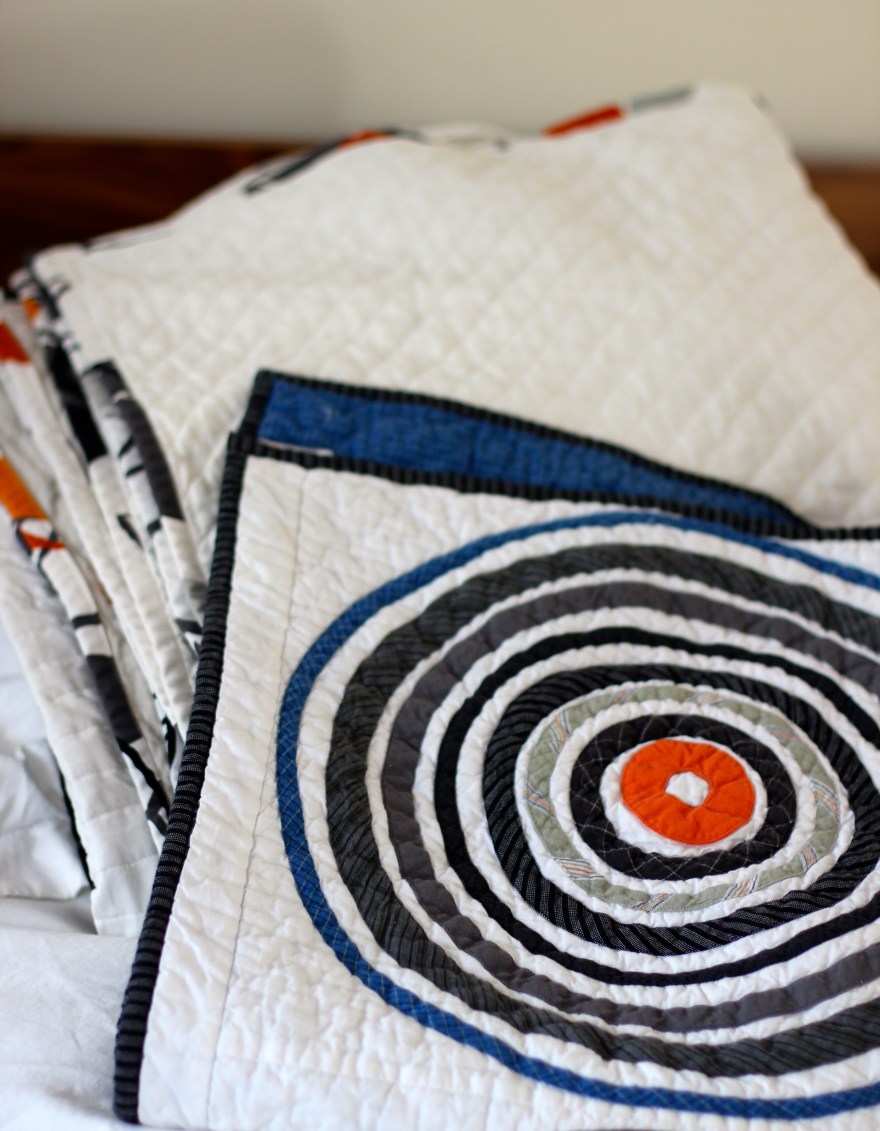 This weekend I decided to quilt up my Plus/Minus Quilt and looked to Denyse and this quilt for guidance. I decided to home machine quilt it in the concentric circles I so love in her baby quilt and I was guided by her color scheme to add similar colors in the binding. I used a linen for the back and an ikea canvas for the binding.