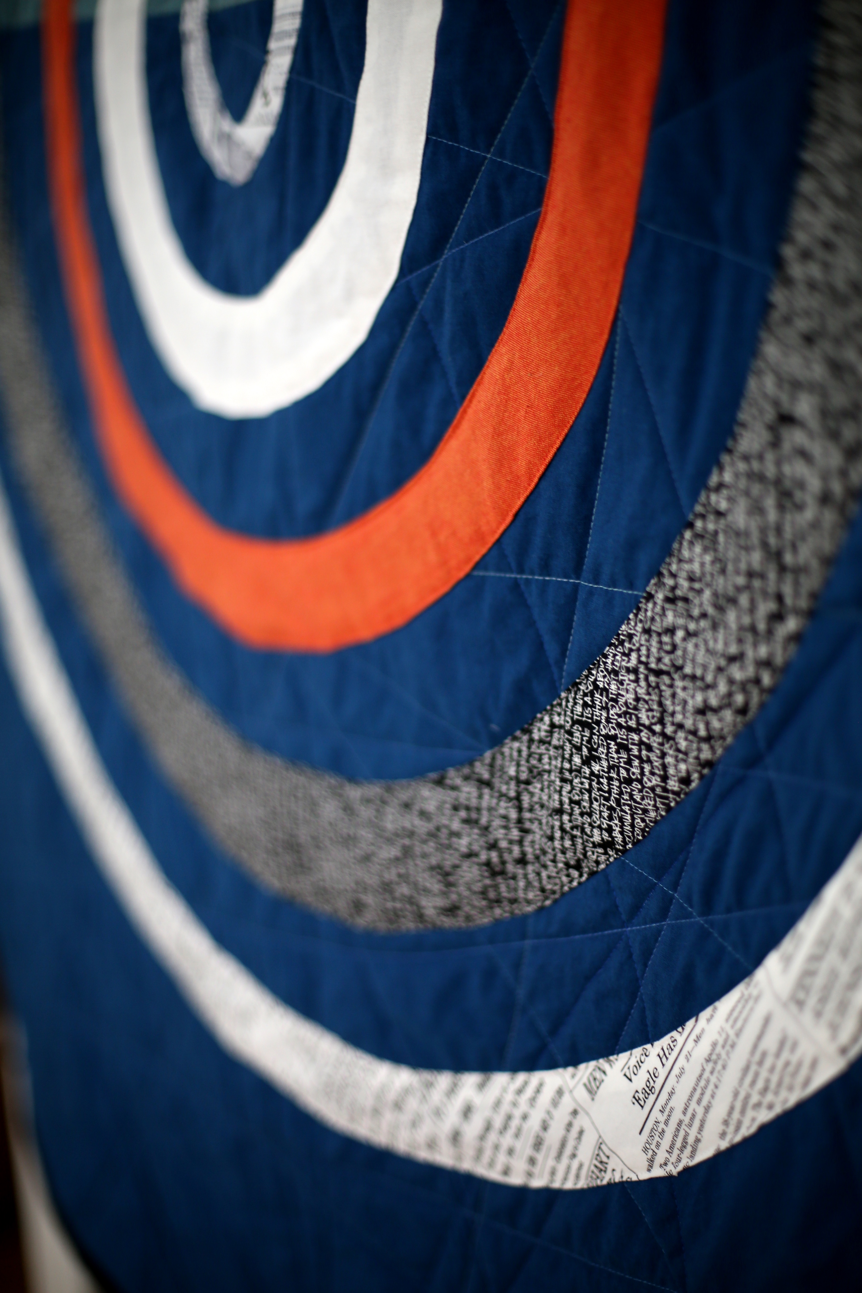 1. Wait, wait, don’t tell me you did this so fast! You just got back from those trips! You amaze! I love the message here. The circles as constant streams of information in varing degrees. I love the color choices as possible metaphors for serious, fluff or sensational news. What a wonderful statement here. I am probably reading too much into it, but the bullseye begs the question, “Is all this information hitting the mark?” The text fabric ties it all together brilliantly! Wonderful!