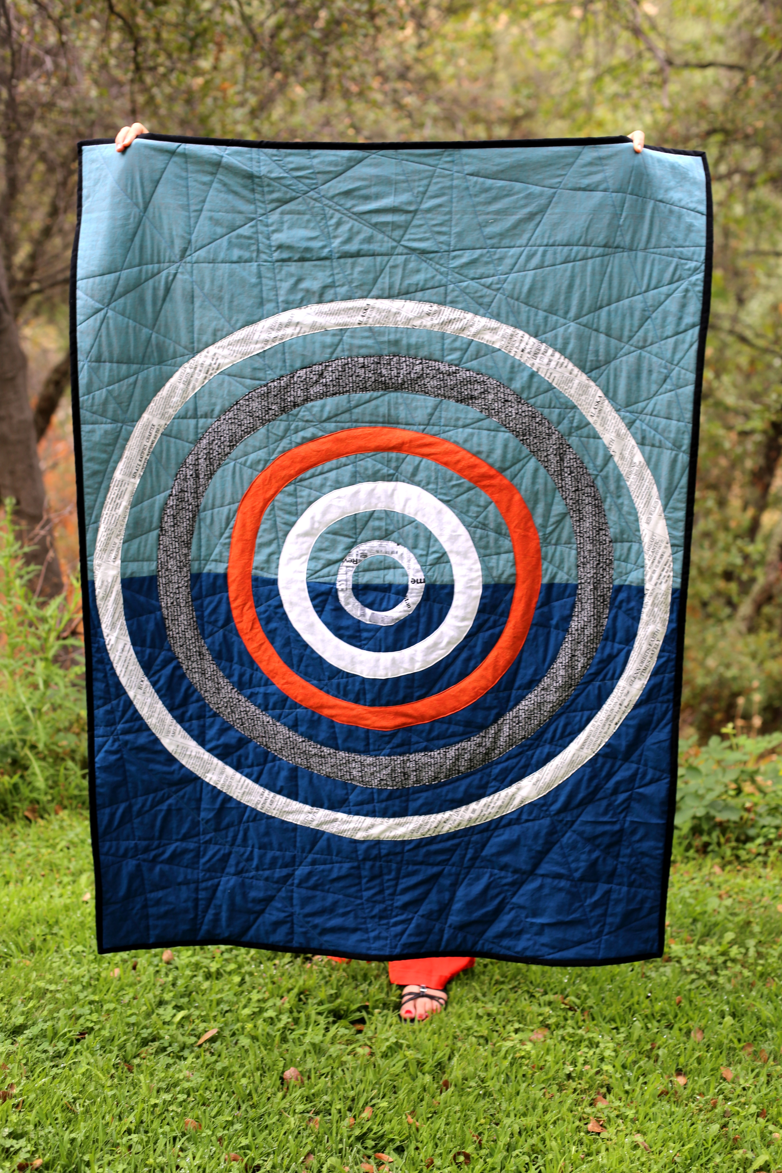 I knew I wanted to use concentric circles and thought I would use bias tape.  This concept failed fairly quickly and I moved on to folding my fabric in quarters and drawing quarter circles with a compass.  Truth be told this gal has never taken any formal quilt/sewing classes and I’m kind of a Macgyver in my constructing.  I started by making and quilting my quilt sandwich with random straight lines of 5 different colors of Aurifil blue thread then machine embroidering the circles on top.  (I have no idea if this is how it’s supposed to be done but it seemed to work.)