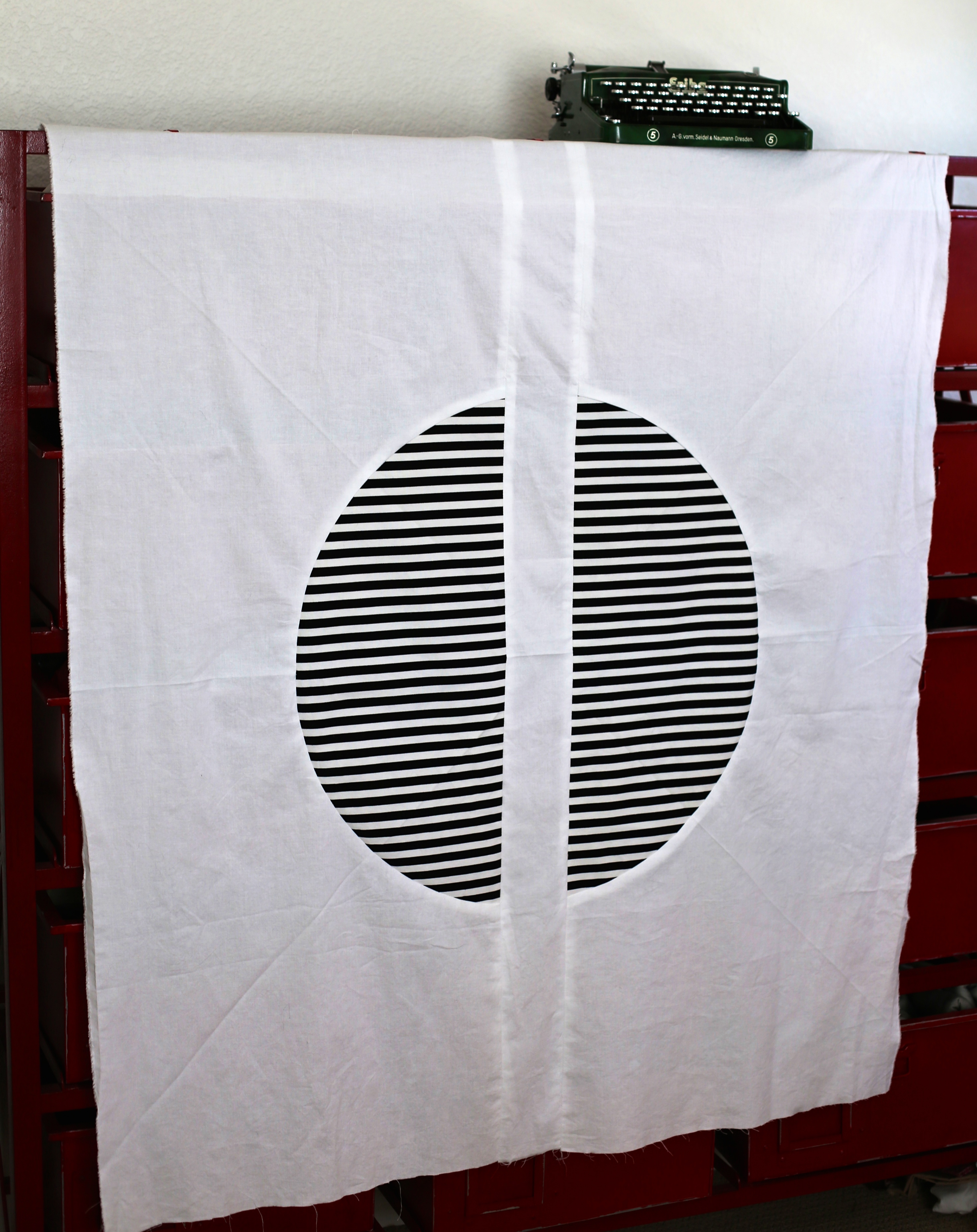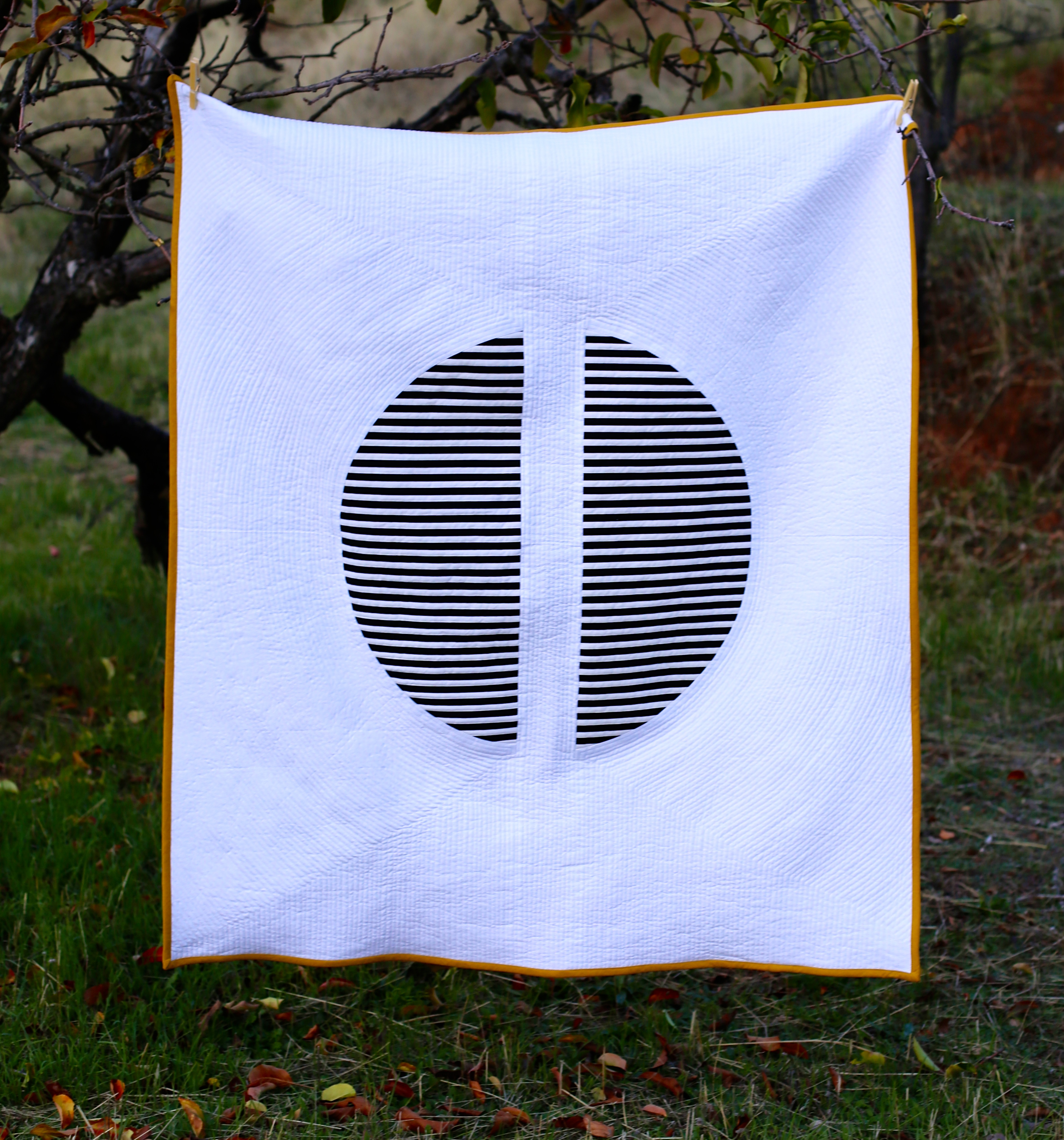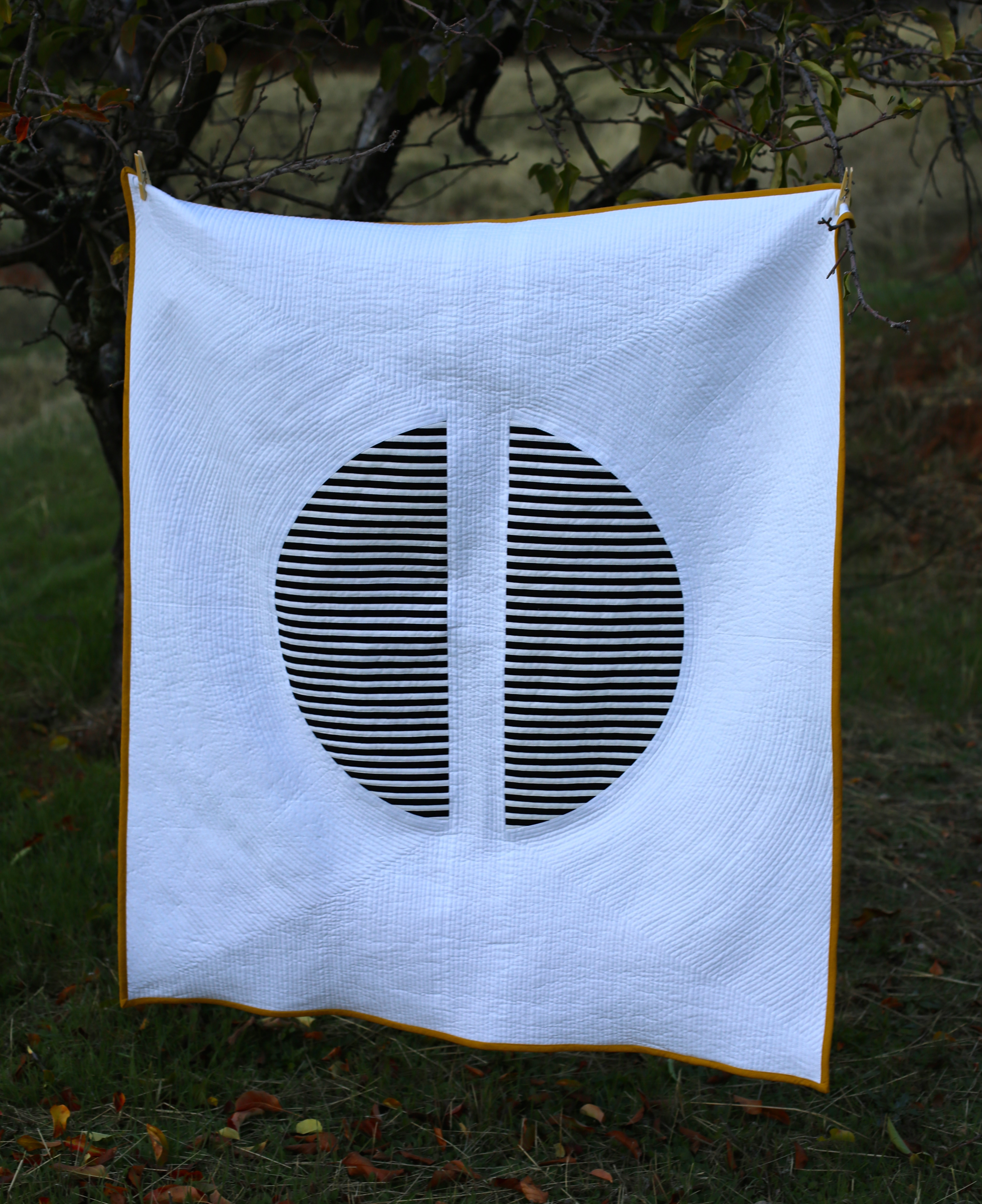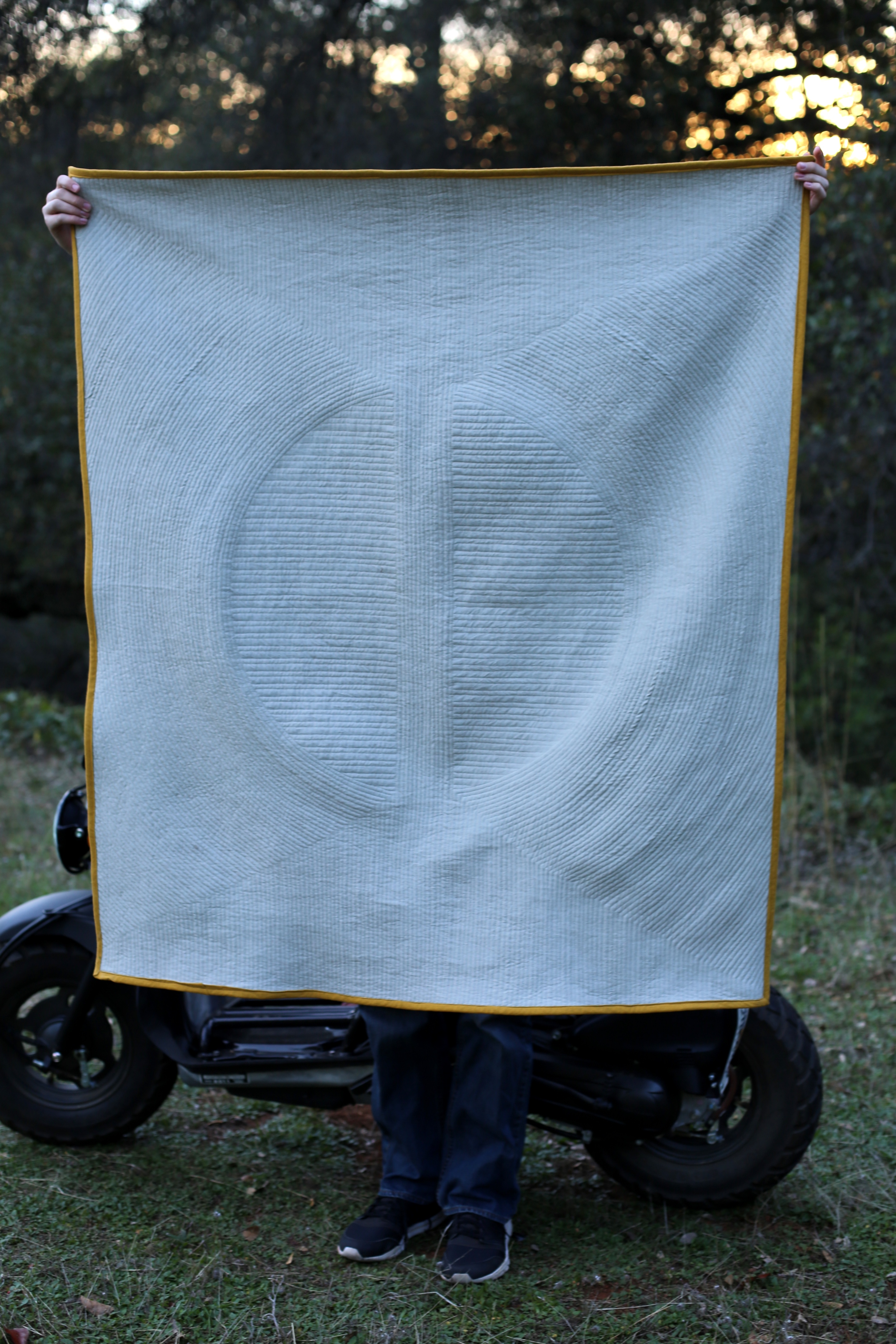 9L4A32459L4A3246My son who was riding his scooter all over the property was kind enough to stop and hold up my quilt for a picture.  It tickles me to see a quilt with he and his scooter in the background. 🙂IMG_1001IMG_0749I got the idea for this design from a modern poster that I saw somewhere but can’t remember the exact source.  Yep, I’m all about cirlces these days.  I must admit this was a pretty darn easy design to make with a large pieced circle that I then cut in half and inserted a strip of Kona white.  The striped fabric is Ikea canvas.  The tight quilting I used with the design made up for the ease in piecing.  I used my walking foot with aurifil thread and tried to emphasize the simple pieced shapes.  I don’t know that I have ever done such tight quilting before and it was interesting to see how it changed the feel and form of the quilt.