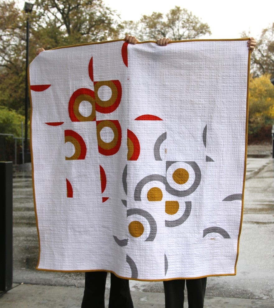 Do you remember that song by the 80s one hit wonder band Dead or Alive?  Well after a lot of consideration and great suggestions, it seemed the perfect fit for my new quilt.  What a labor of love this quilt has been.  The design was inspired by a modern poster and per my usual I picked some fabric and started cutting and sewing.  My husband’s woodworking measuring tools once again came in handy and at the end I got pretty good at piecing concentric circles.  I did crosshatch irregularly spaced quilting with Aurifil thread for the first time and used my ever-dwindling mustard linen for the binding.