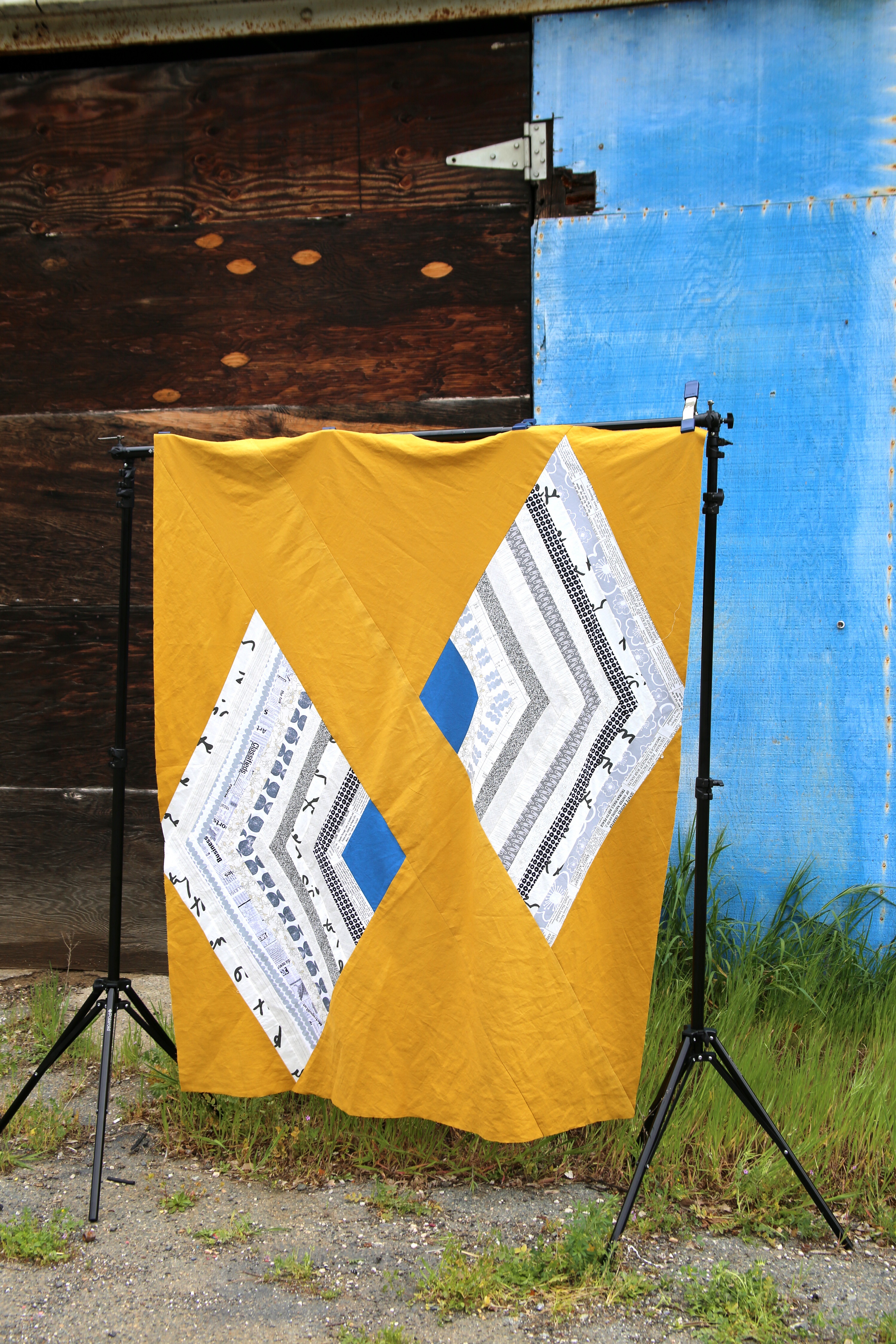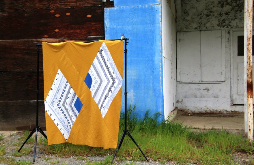 On my daily drives I pass by a beautiful abandoned gas station.  It is a remnant of the old Lincoln Highway that is now virtually unused since they built Highway 80 here in Northern California.  The blue wall and wood paneling of the station called for pictures (and that color combo deserves a quilt too don’t you think?).  While I stopped and set up my portable backdrop, the elderly owner came out to chat.  No question he was leery of me at first but warmed quickly when he saw my quilt.  It is hard for anyone to be threatened by that.  As I drove away I realized the quilt needed to be called “Old Blue Eyes” as the blue diamonds remind me of a steel blue gaze and in reference to the lovely old man who let me take pictures on his property.