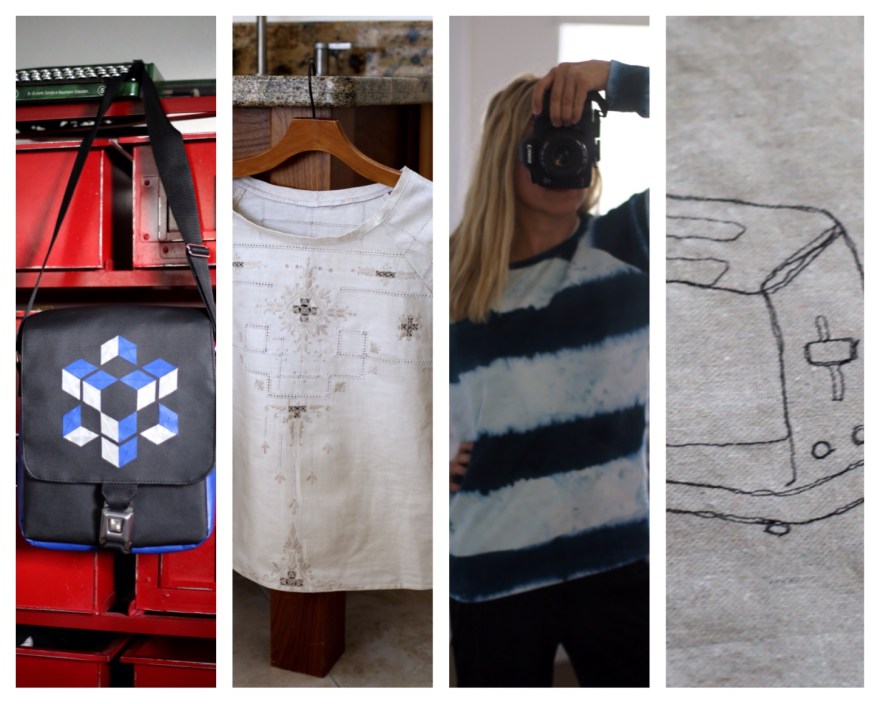 Messenger Bag with Reflective Material donated by Stephanie (Spontaneous Threads) and repurposed seatbelt closure-my design :: Linden Sweatshirt out of a vintage tablecloth :: Linden Sweatshirt out of organic fleece I hand dyed-both as part of #memademay :: My first adventures in free motion quilting with help from the book Stitch Draw by Rosie James :: Umbrella Prints collaborative project begun :: Blue WIPs.