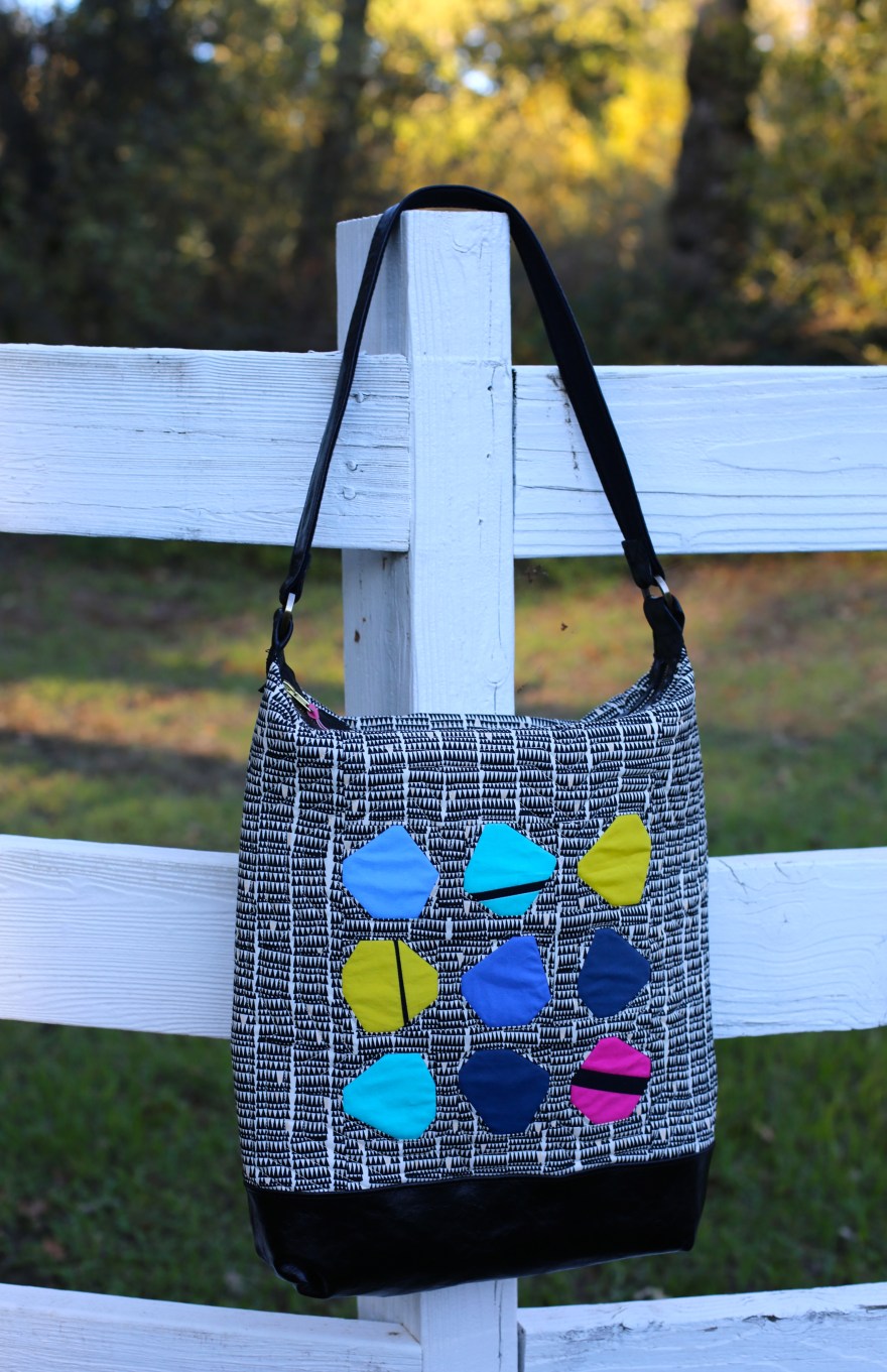Those who know me understand that I have a special passion for bag making. I decided that my first make would be a bag using Nancy’s Stones Quilt pattern. I sized the pattern down to three quarters size, used 9 “stones” instead of 15 and utilized a bag design of my own. I also used Pellon Flex Foam Stabilzer for the first time-a wonderful discovery. It gives my bag some nice heft and shows off the quilting beautifully. I will be using this more in my makes. In any case, I grabbed some bright Kona solids and used a Carolyn Friedlander print as background with new black leather for the base and handle. I am pretty pleased with how it turned out and think it shows how different this pattern can go with varied color themes and fabrics.