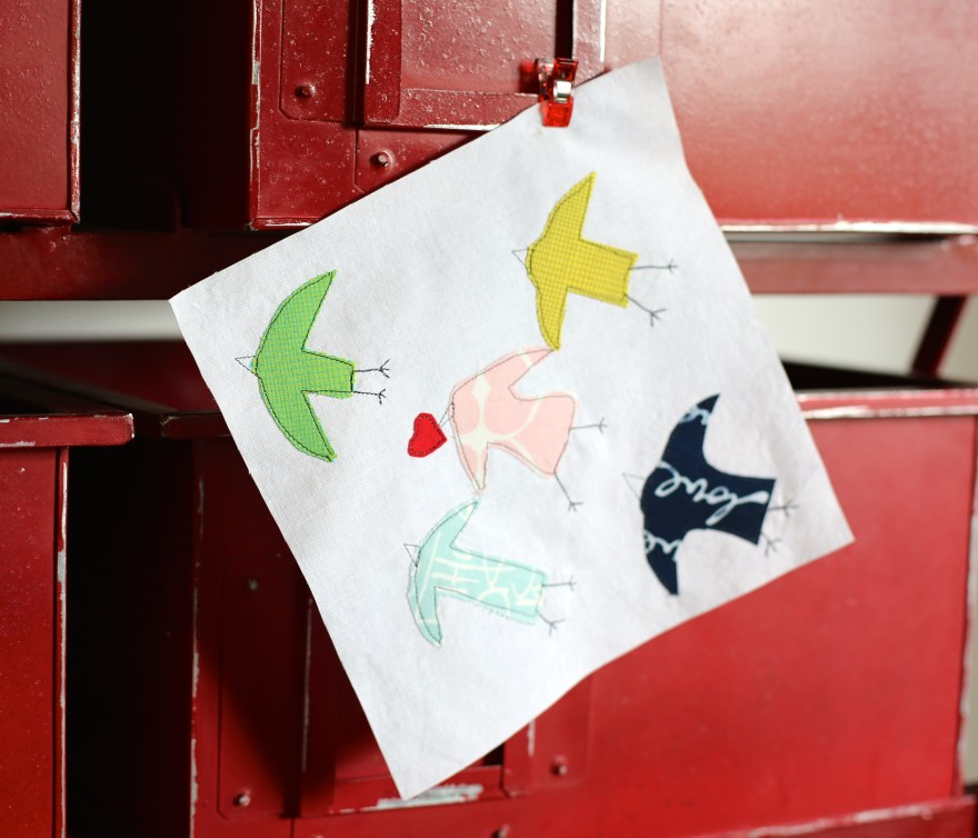 -Cheery prints to be used for the appliquéd birds (this is a perfect project for scraps).  I would love to have birds that are simple and FLYING like Kajsa’s but I am also happy for you to make them your own, and even add encouraging stitched words for Merel if you like.  An example of Kajsa’s birds is below and they also can be found at her flickr page (https://www.flickr.com/photos/sykossa/4567924620/in/album-72157601967630500/)
