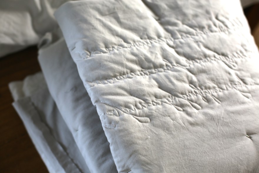 In the end, I decided to continue the minimalism theme and connected the blocks with extra negative space.  The words spoken when describing these blocks became the quilting motif in free motion quilted cursive writing (the first I have done this but certainly not the last).  The whole was surrounded with quilted borders and a gilded binding (purl soho mineral linen which sparkles when seen at an angle) to enhance the theme of story.  I want it to read like a well worn and treasured book.
