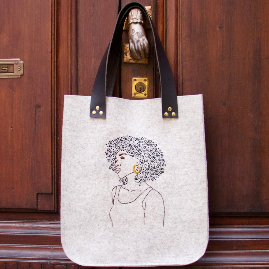 When picking a project from the book to make I decided to use some 5mm wool felt I had on hand in a minimalist style. Bianca’s book has 10 projects and over 100 images to use! I chose one of my favorite pictures, a beautiful dark skinned woman with her crown of stars which I printed onto Sulky Stick N Stitch stabilizer. I used both wool and cotton embroidery floss in her Afro then sewed up the felt into an easy tote with leather handles. It has been my constant companion as my husband and I travel throughout Spain garnering compliments everywhere.