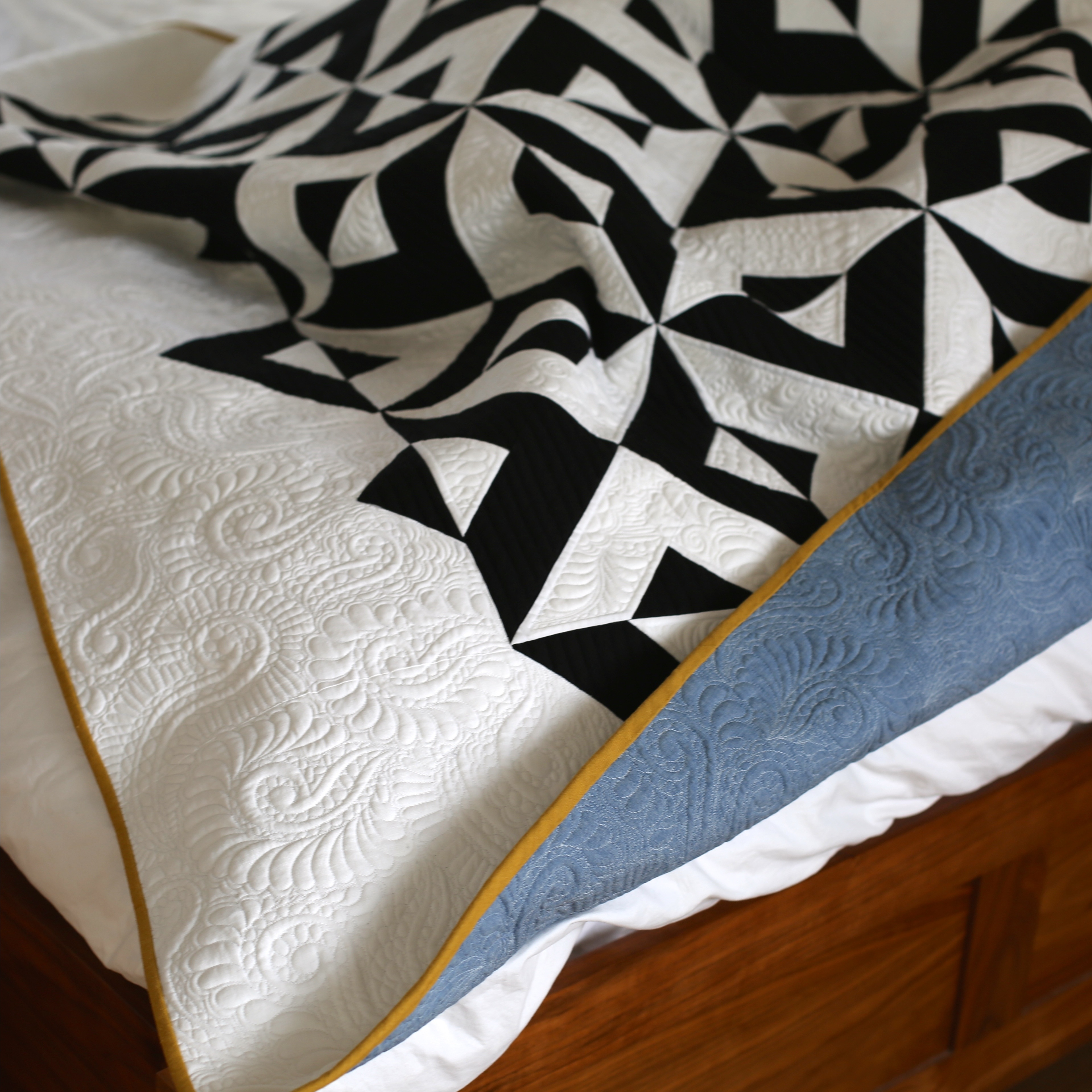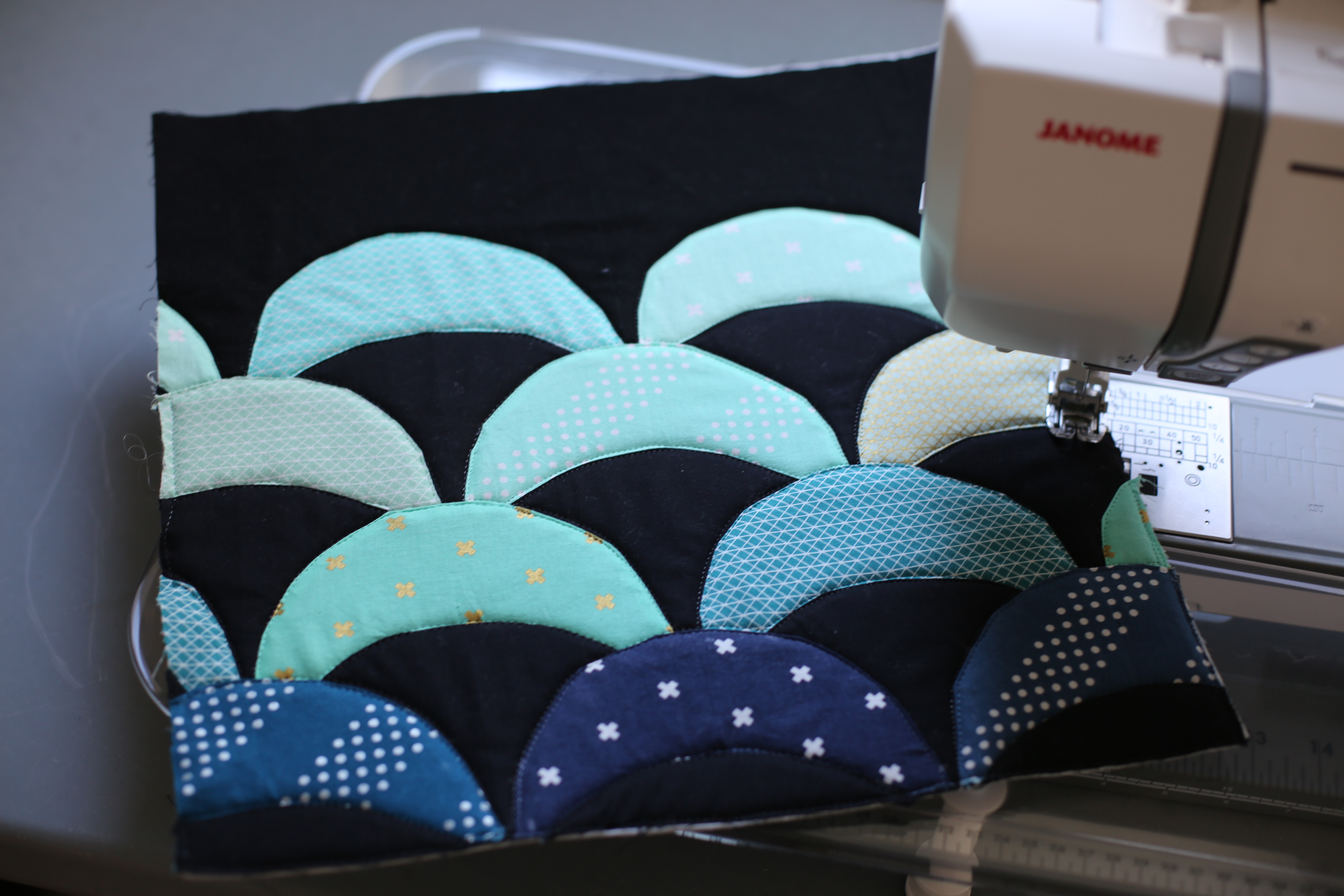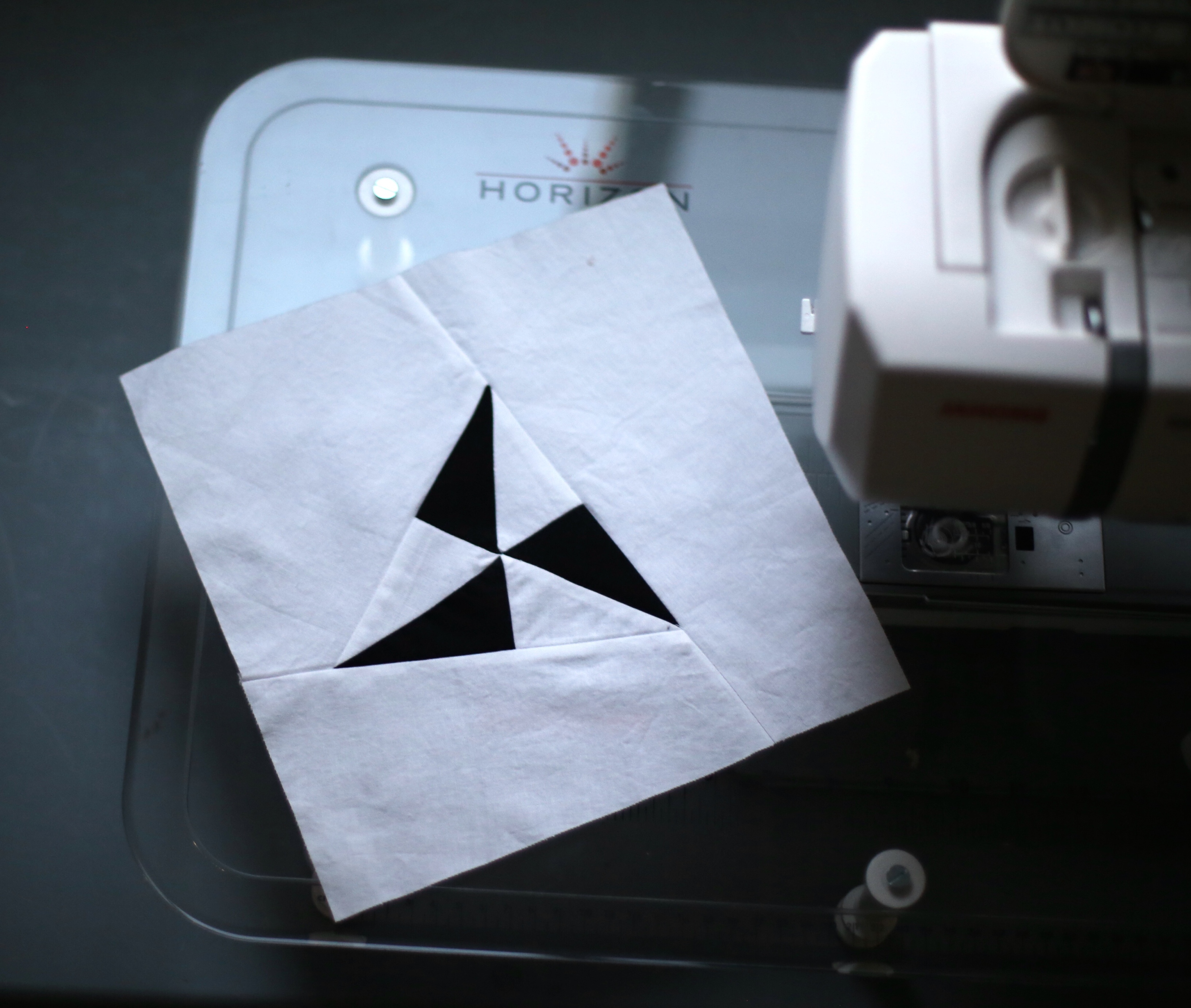 Further secure them all together by stitching 1/4 inch again around the block through all three layers.