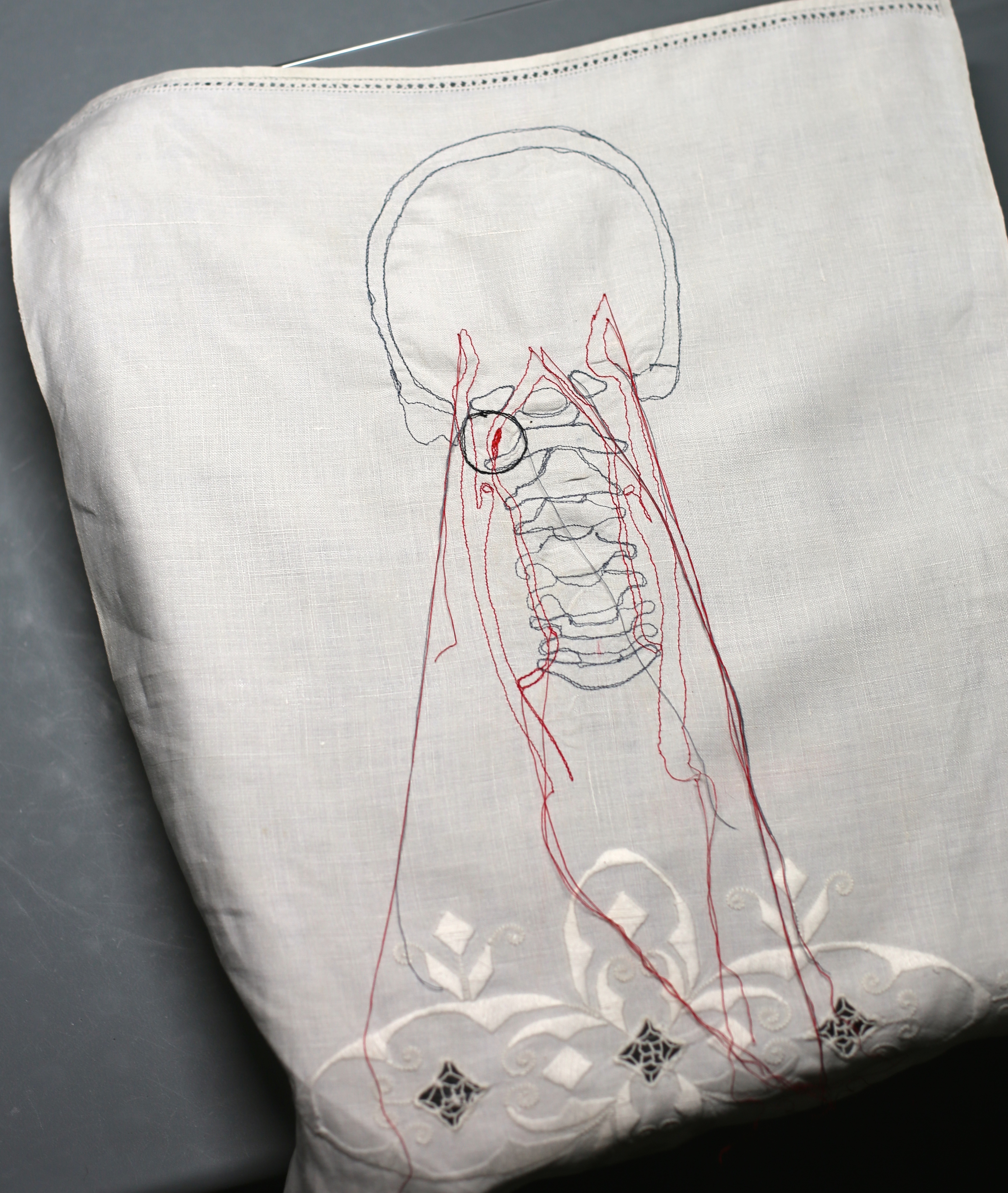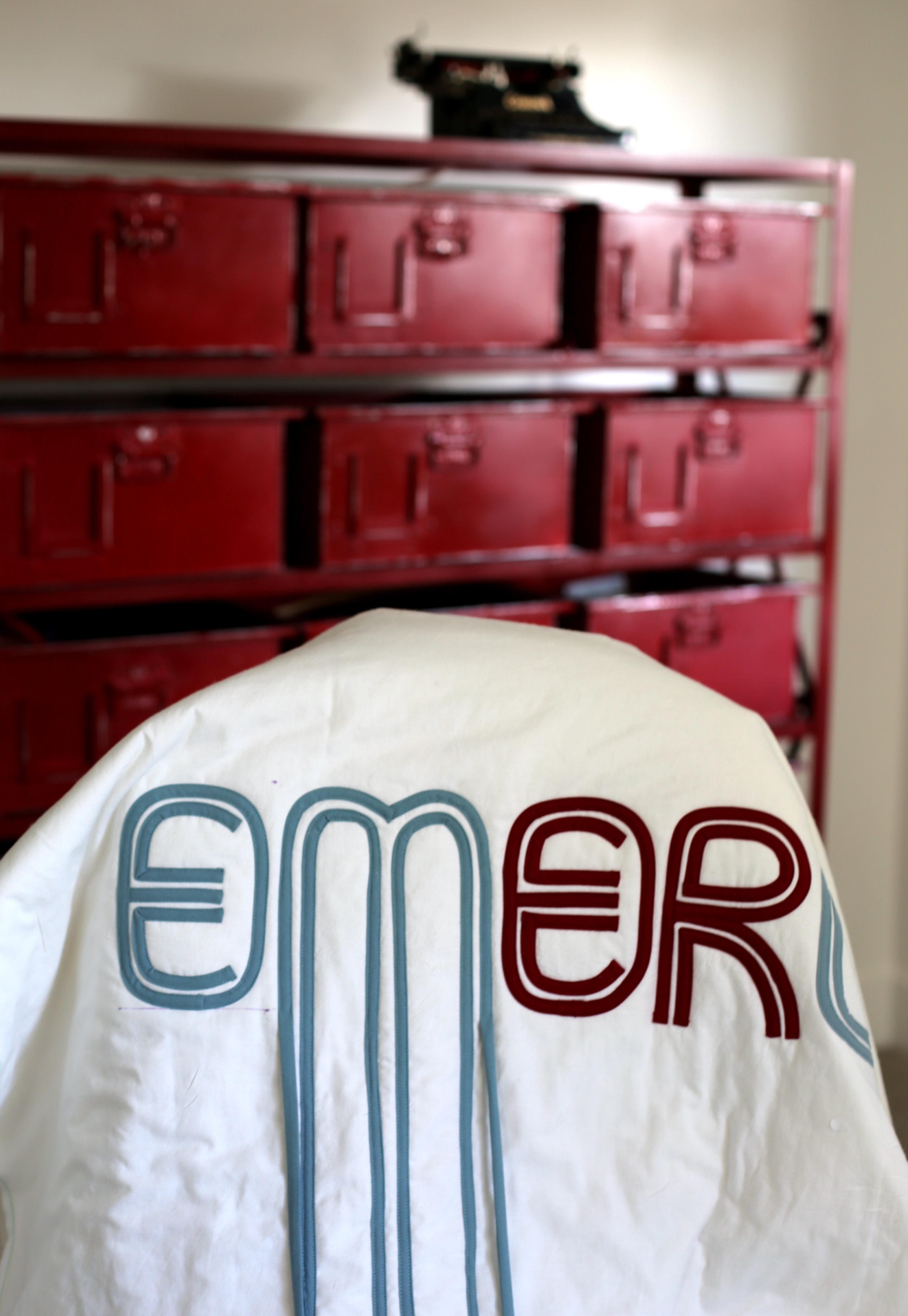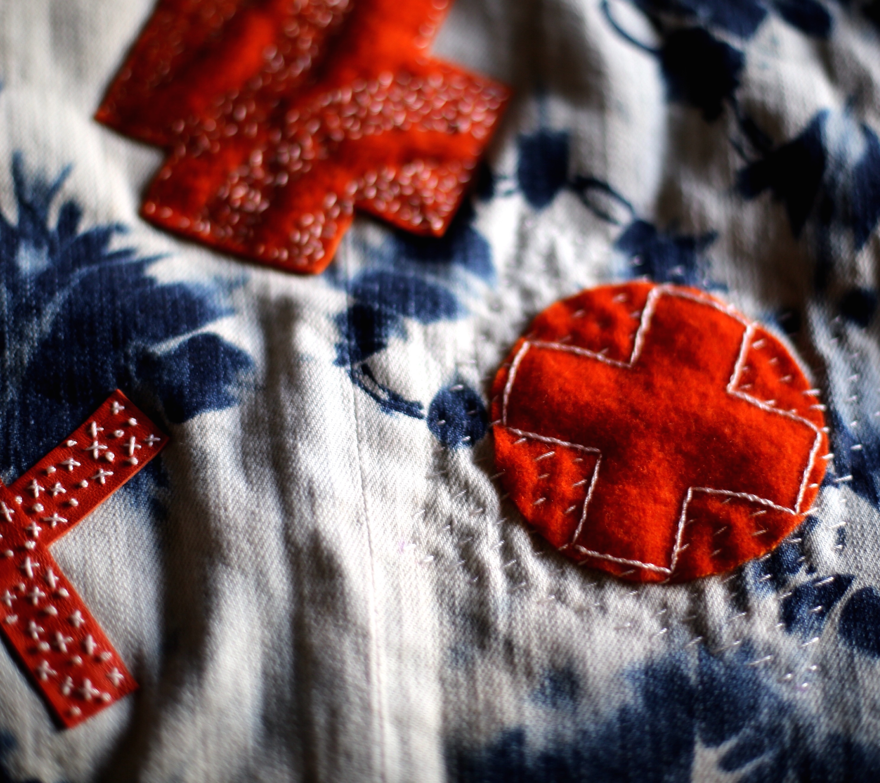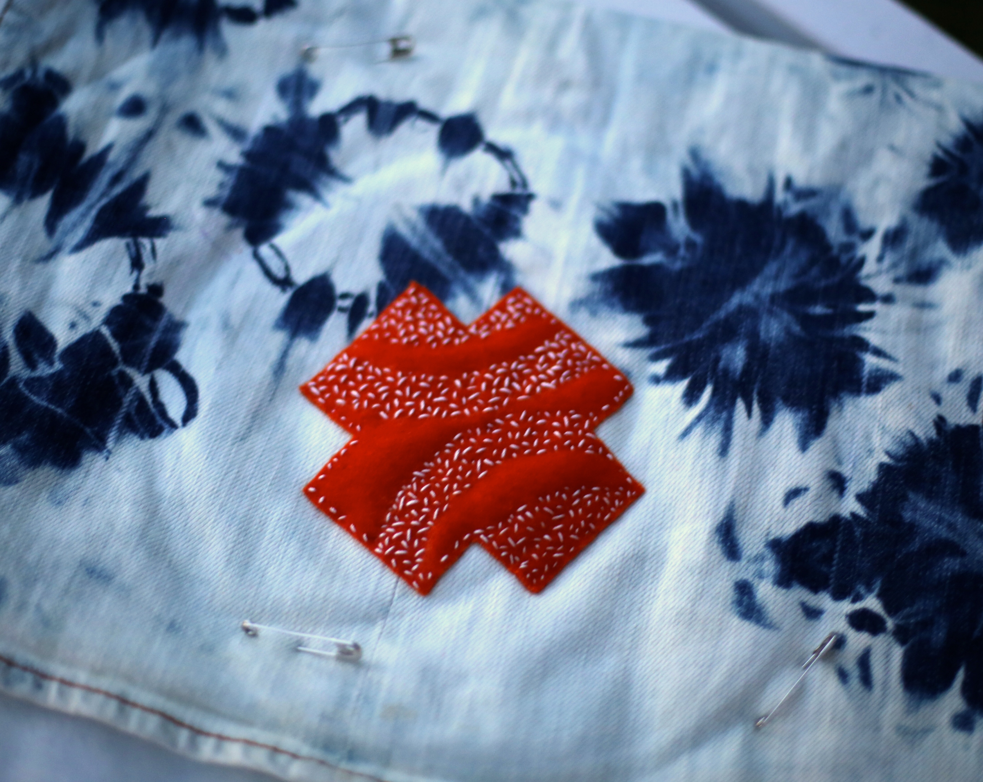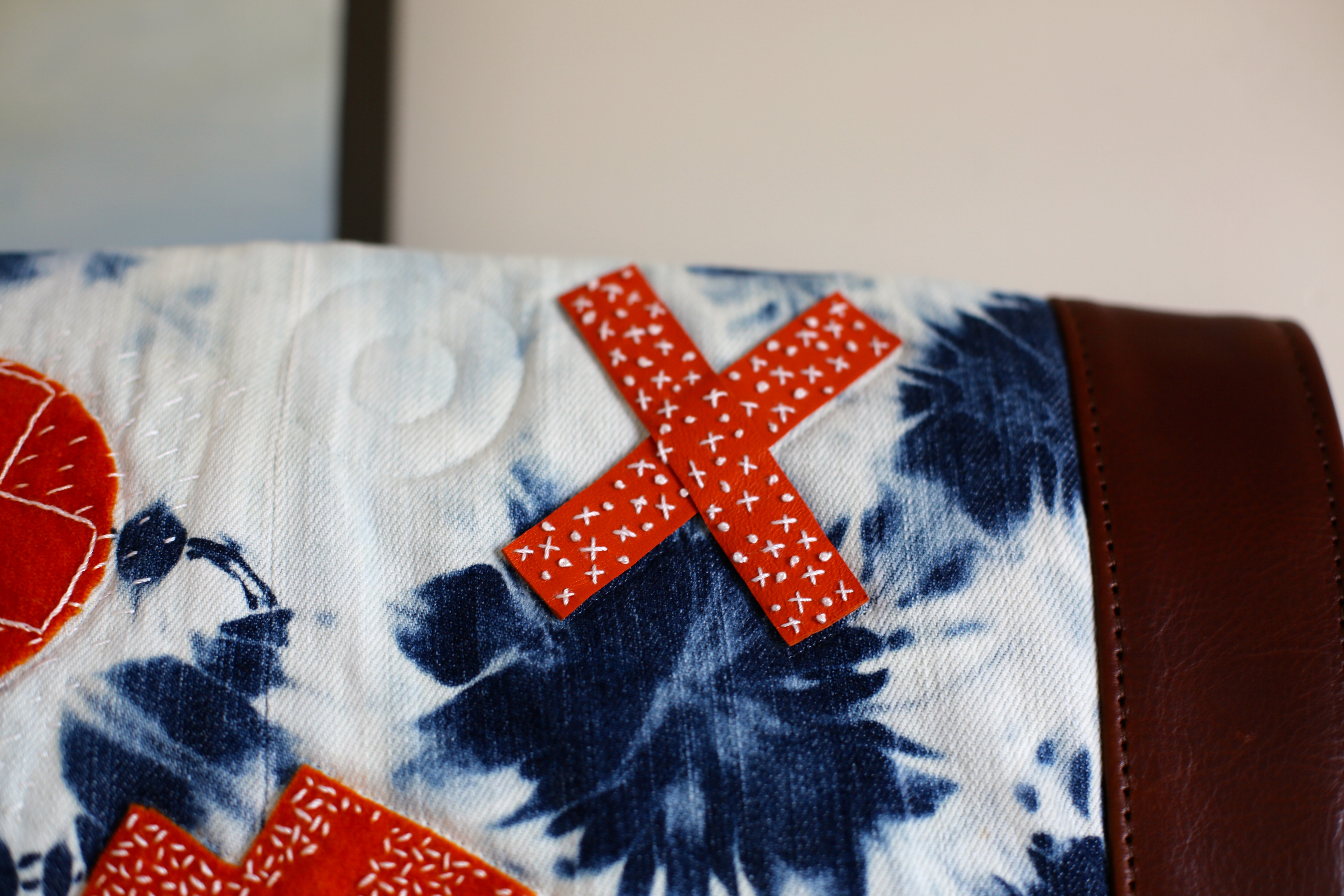 Choose a cut out motif that you will use on you front felt piece (in this example, I used a 6×6 inch red cross sign) , mark with your marker and cut out with an Exacto knife. In previous iterations of this design, I have used a circle, rectangle, lightning bolt and a combination of shapes that will show off the piece I plan to show off in the reverse appliqué. Let your imagination guide you.