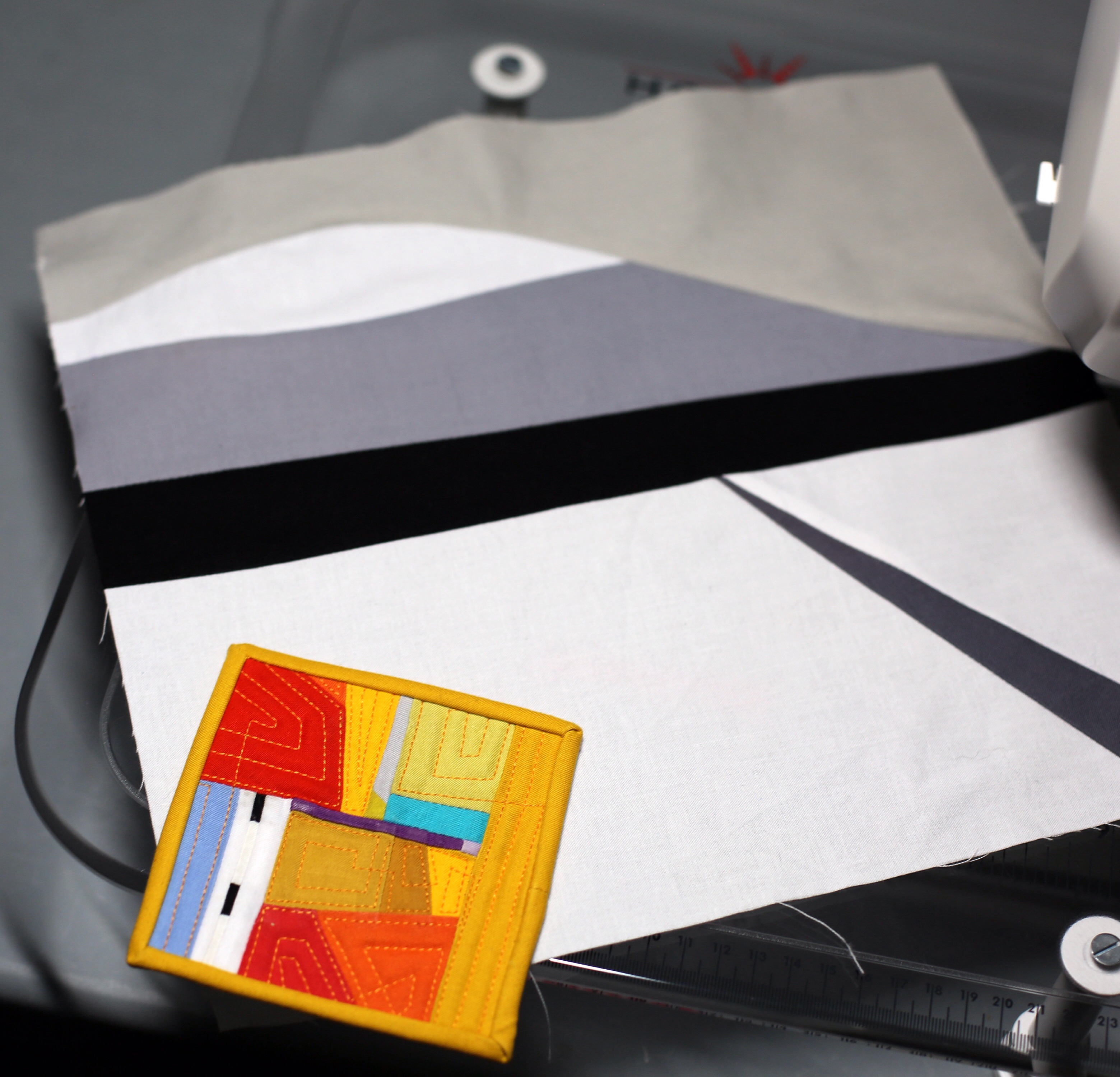 Pieced block or textile that you want to feature on the bag in a reverse applique technique less then 9 1/2 x 9 1/2 inches (I have used paper piecing patterns, leftover quilt blocks, improv panels made from scraps. The sky is the limit.)