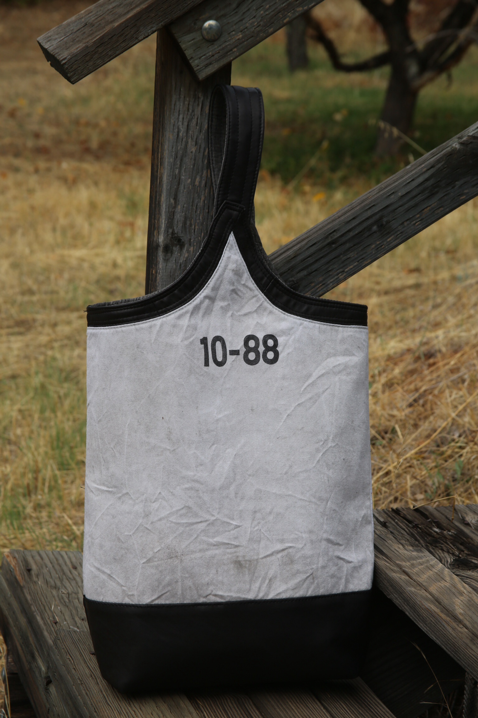 Repurposed Leather (used for the side stripes of the bag and outside handles) cut into two rectangles