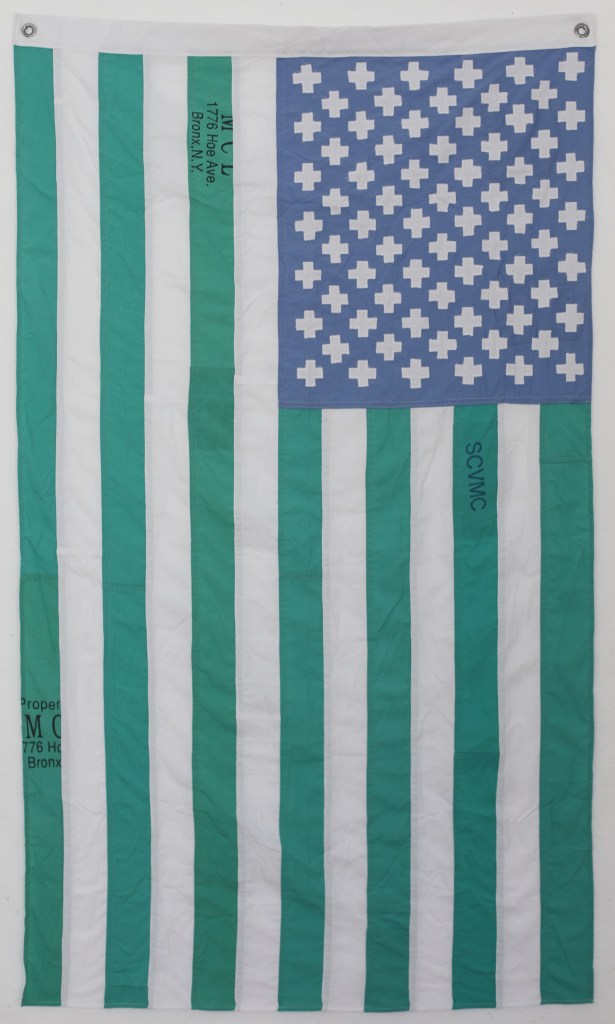 Flag made from Scrubs donated by my colleagues used during their training around the country and paired with a hospital sheet.