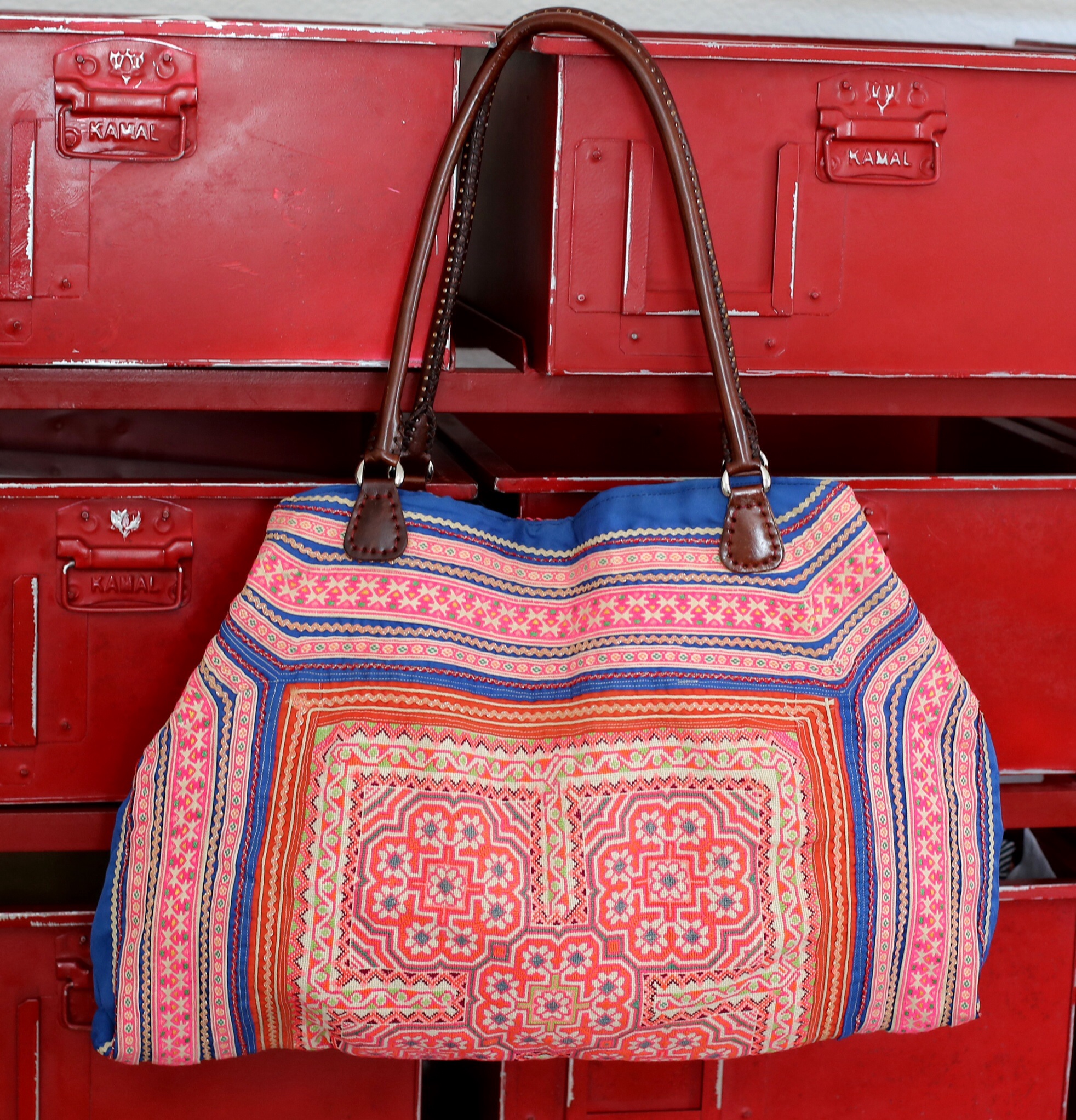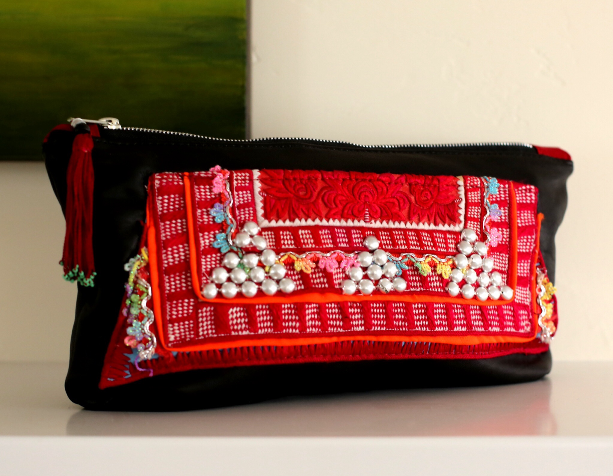 I got into a bag making frenzy this week and sewed up some vintage Thai textiles.  The first was a clutch I made with the sleeves of a black leather jacket a nurse friend gave me.  Once again I used a tribal tassel repurposed from a belly dancing costume for the zipper pull.