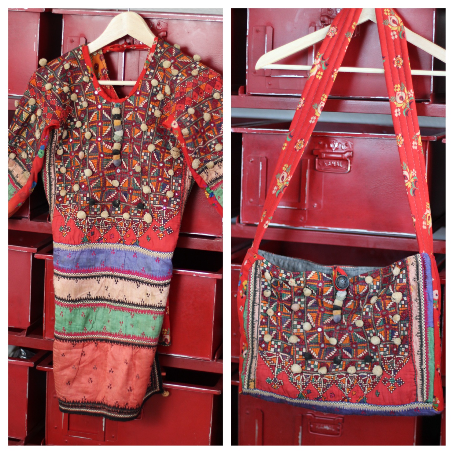 Vicki picked up some amazing textiles on her journey, one of which was an elaborate antique shirt that she had custom fitted. Despite some extensive time fitting her in India, the shirt was quite binding and she felt that she would never wear it. Knowing my love of textiles and repurposing, she offered it up to me to remake into something she would use. With great care and delicacy, I ripped seams and cut into this 90 year old garment. GASP! I used the back fabric to make a bag strap and folded the front into a simple bag shape. I used some of my own linen which i random straight line quilted with cotton and fusible batting as the liner to give the bag some extra structure. I then used a vintage button from my growing collection to help secure the top.