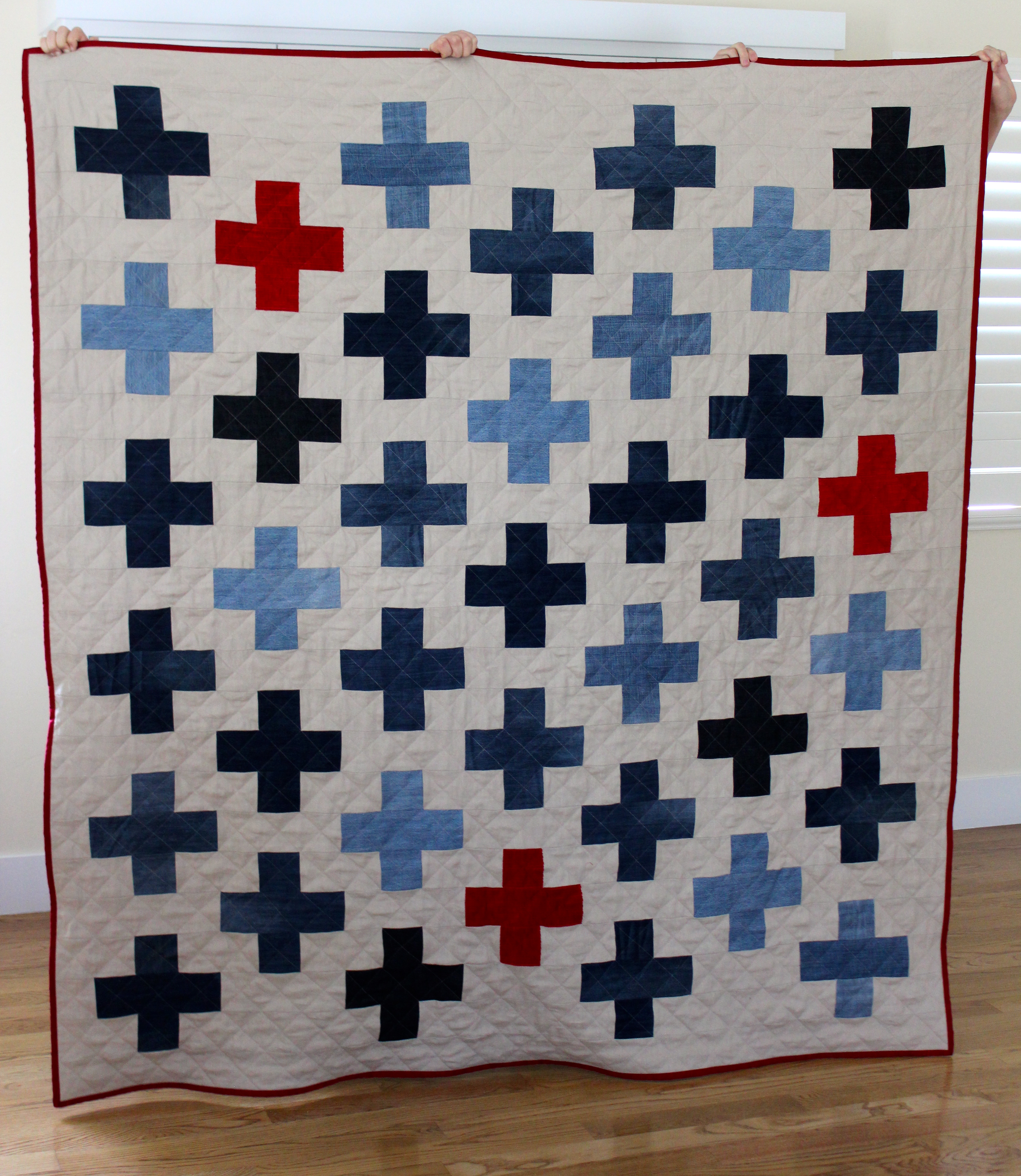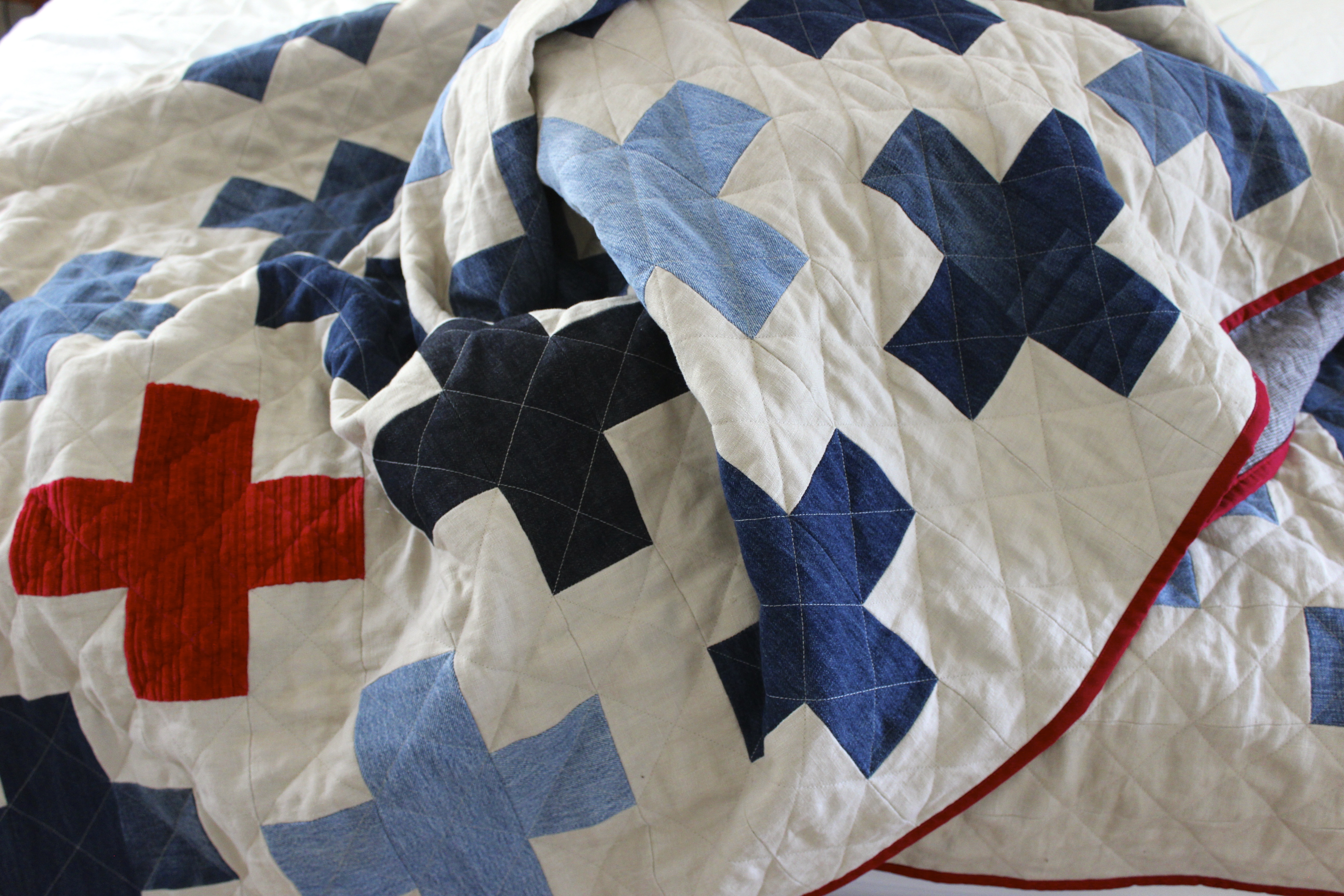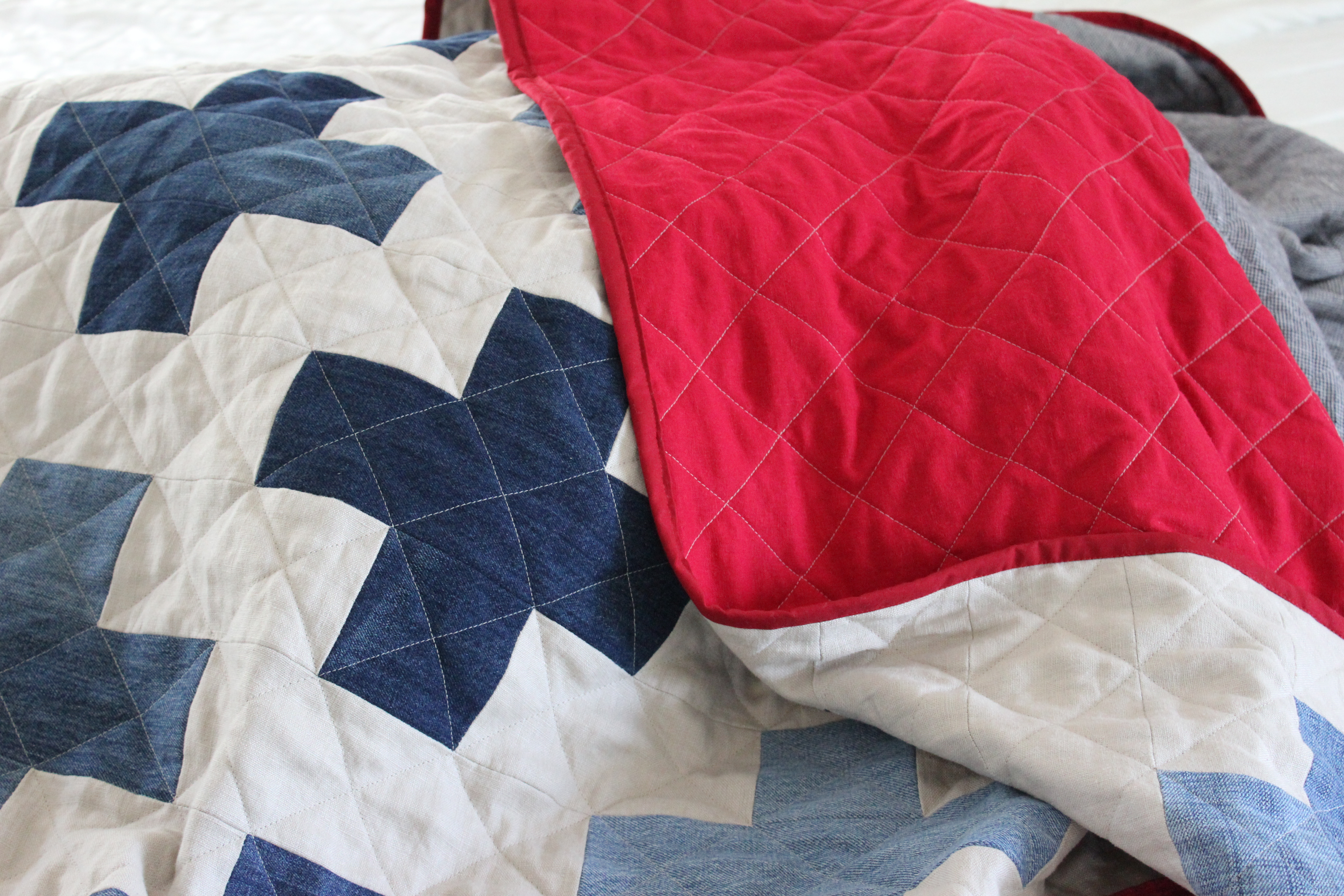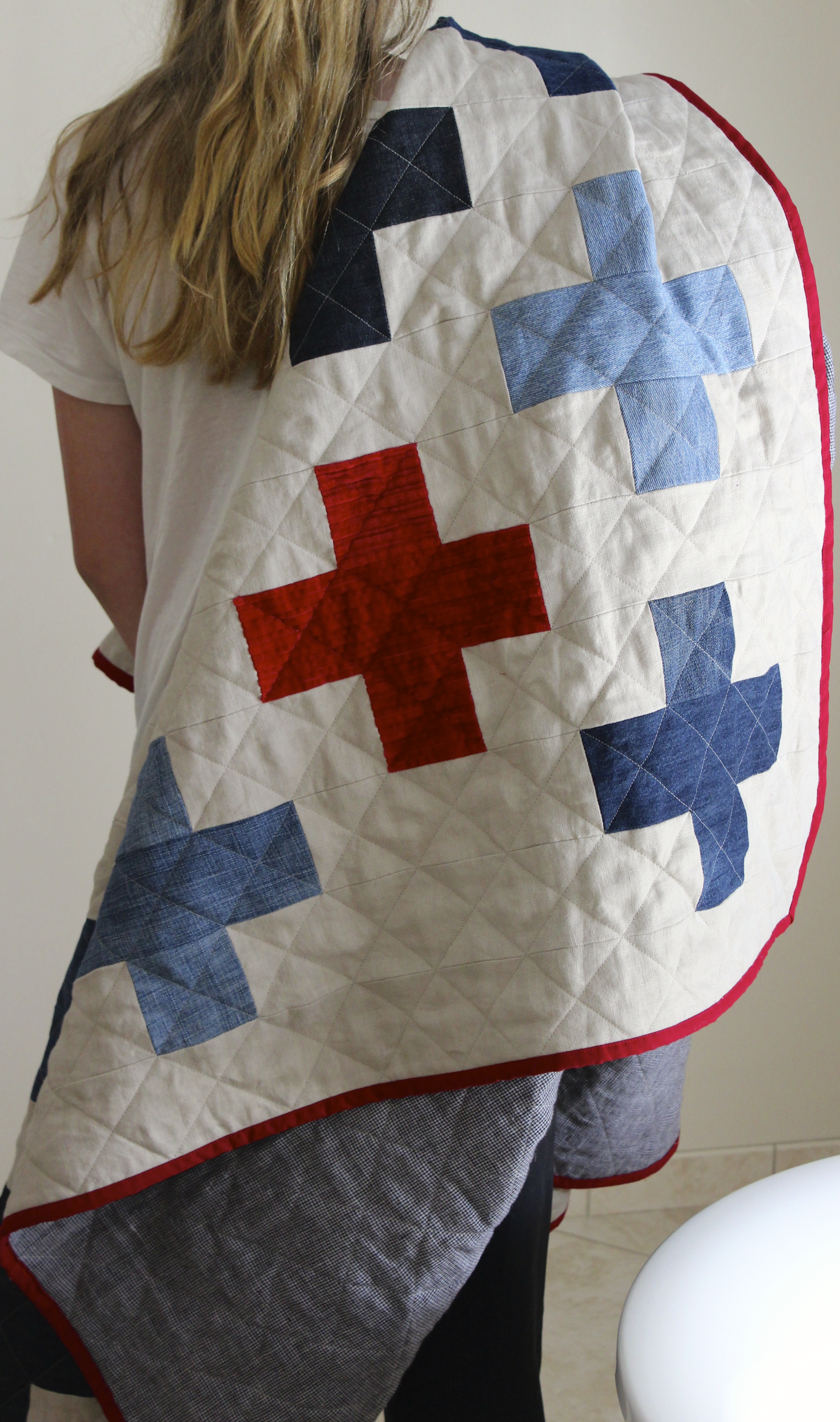 To add some humanity and a little imperfection (I don’t like things too perfect honestly) I pieced the binding in alternating red and blue striped shirt fabric from the Goodwill.
